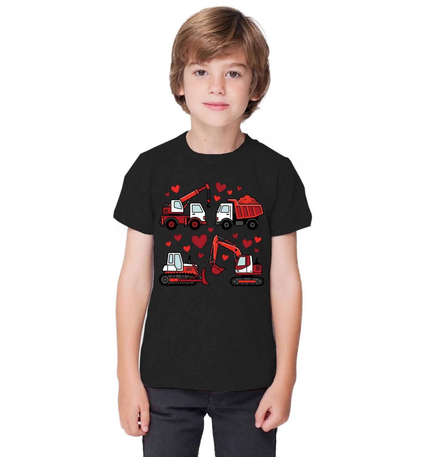 Dětské tričko Láska ke Stavebním Strojům. Roztomilý motiv pro všechny malé i velké fanoušky stavební techniky. Uprostřed designu najdete několik oblíbených strojů – nechybí bagr, jeřáb, sklápěčka ani buldozer – a všude kolem poletuje červené srdce, protože láska ke stavebním strojům je prostě věčná.