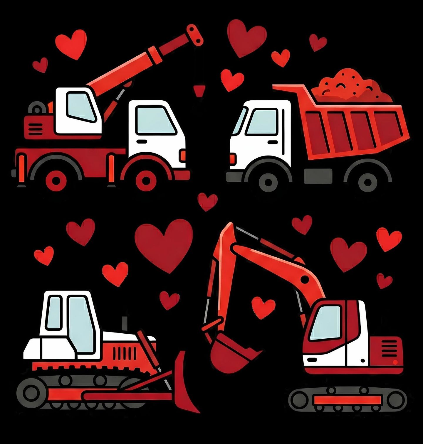 Pánská mikina Láska ke Stavebním Strojům. Roztomilý motiv pro všechny malé i velké fanoušky stavební techniky. Uprostřed designu najdete několik oblíbených strojů – nechybí bagr, jeřáb, sklápěčka ani buldozer – a všude kolem poletuje červené srdce, protože láska ke stavebním strojům je prostě věčná.