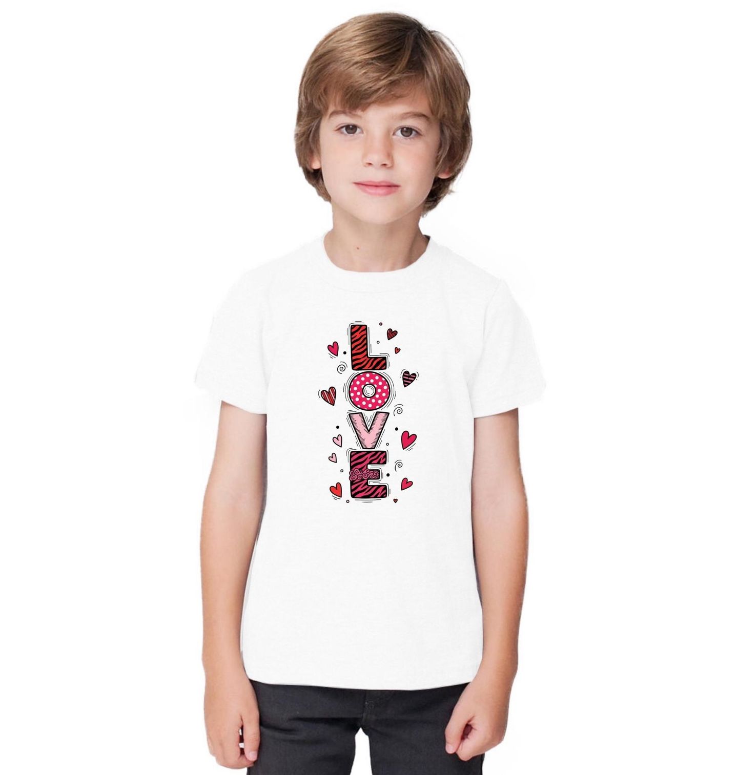 Dětské tričko Láska LOVE. Něžný a hravý motiv, který dokonale vystihuje, co znamená láska. Ilustrace plná radosti, něhy a emocí pracuje se symbolem srdce jako univerzálním znakem blízkosti a porozumění. Tento design je ideální volbou jako dárek pro valentýn, kdy chcete potěšit originálním a milým motivem, který zahřeje na pohled i na duši.