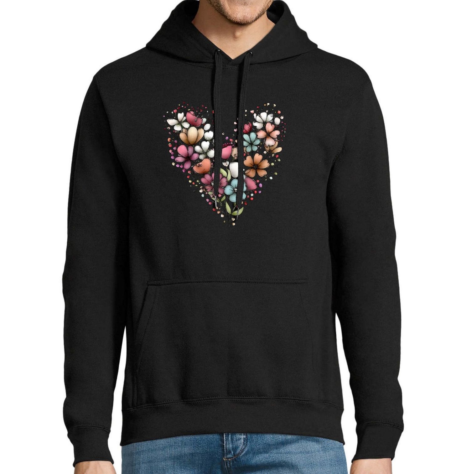 Pánská mikina Láska v Rozkvětu. Jemný a romantický motiv plný barevných květů poskládaných do tvaru srdce je jako stvořený pro všechny, kteří věří, že láska kvete v každém ročním období. Elegantní akvarelový styl působí něžně a hravě zároveň, takže se skvěle hodí jako dárek k příležitosti, jakou je Valentýn, nebo prostě jen pro radost.