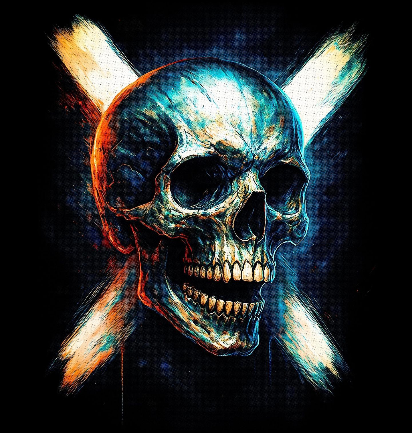 Dámské tričko Lebka a Bílý Kříž Smrti. Tato lebka symbolizuje pomíjivost života, sílu a odvahu čelit vlastnímu osudu. Dynamické tahy a surové zpracování dodávají designu energii a moderní street styl. Výrazný a drsný motiv zobrazuje detailní lebka, která je zasazena do kontrastního pozadí ve tvaru kříže. Kombinace temných tónů a ostrých světelných prvků vytváří silný vizuální dojem, který okamžitě upoutá pozornost.