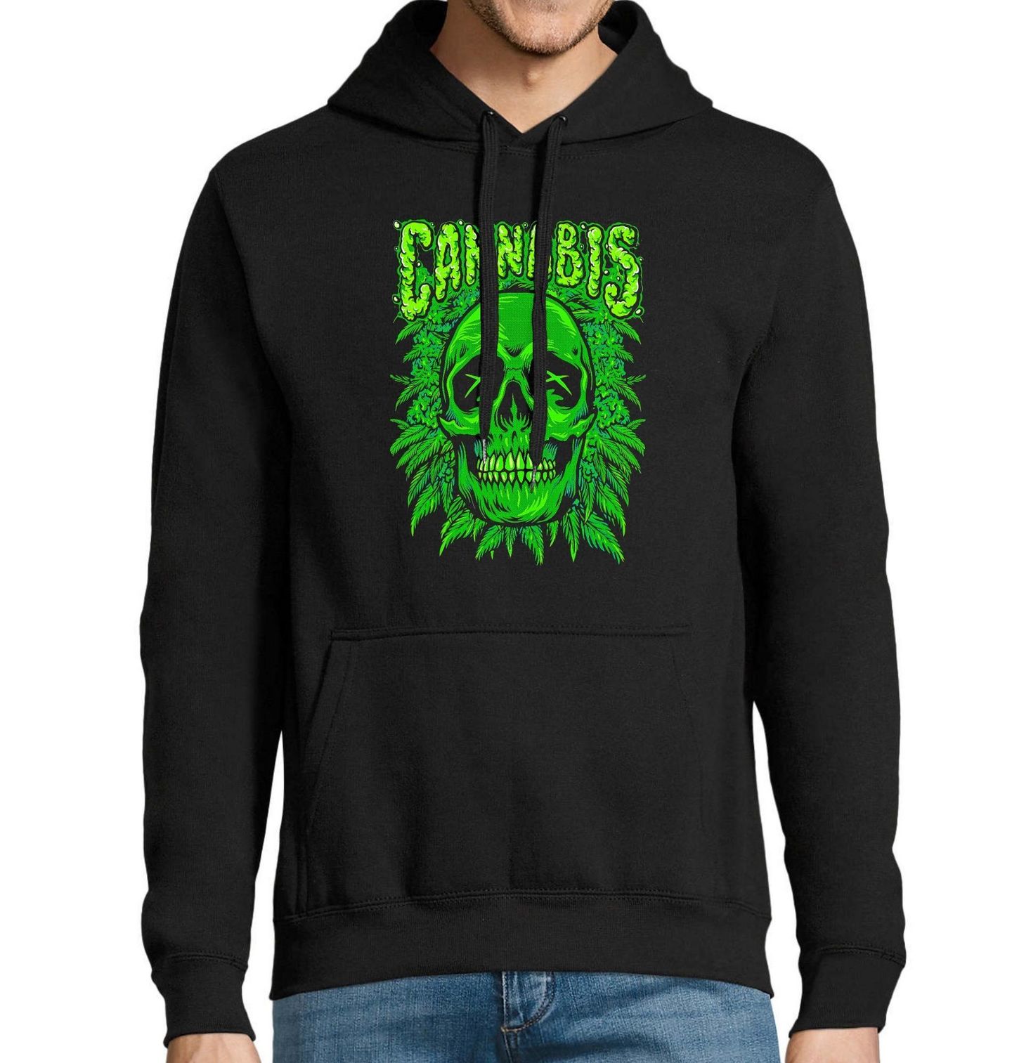 Pánská mikina Lebka Cannabis. Výrazná zelená lebka obklopená listy konopí s nápisem Cannabis – Marihuana vytváří motiv, který na první pohled zaujme svou lehkou ironií. Spojení lebky a konopí může značit varování, ale spíš než smrt tady jde o nadsázku, styl a trošku rebelie.