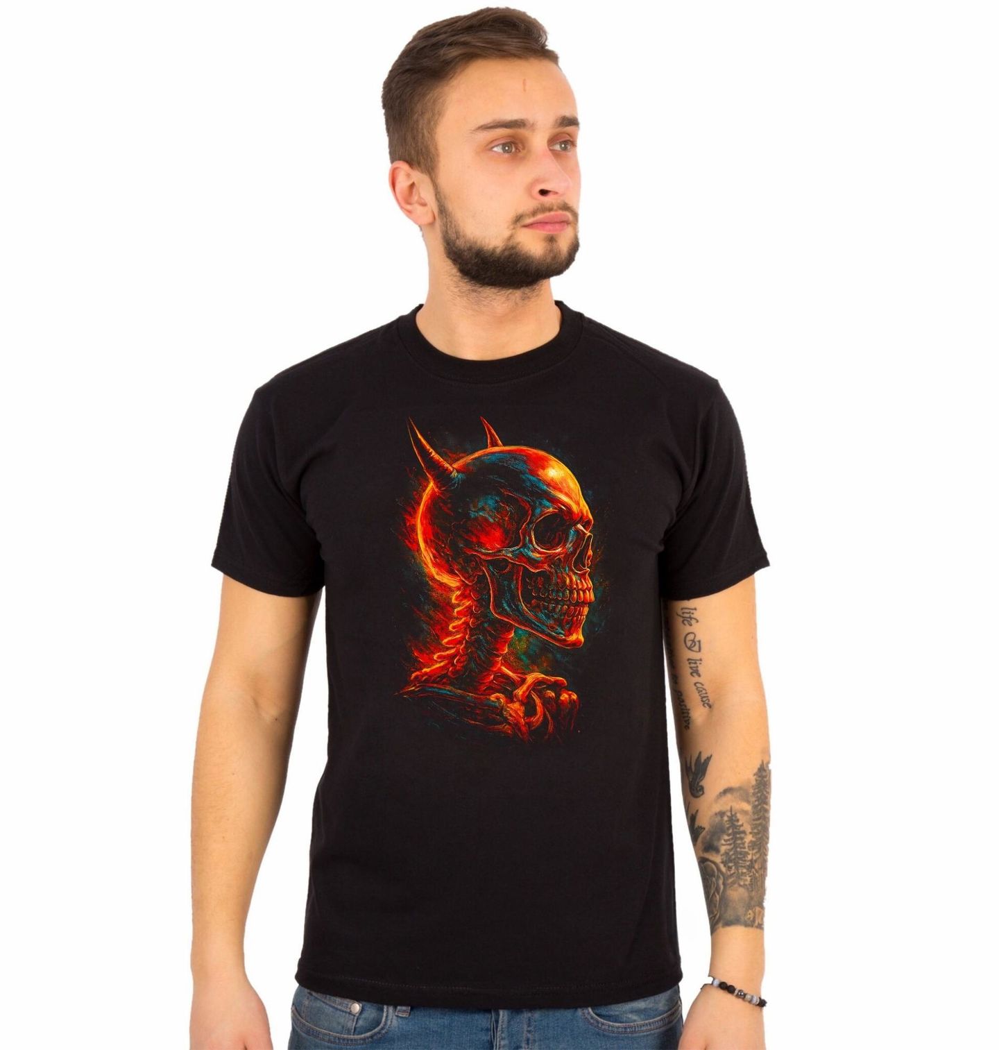 Pánské tričko Lebka Ďábla. Temnota, oheň a čistá síla zkázy – tento výrazný motiv zachycuje kostlivec v jeho nejděsivější podobě. Žhnoucí lebka s ďábelskými rohy symbolizuje přechod mezi světem živých a peklem, kde vládne chaos a nezkrotná energie. Kostlivec zde nepůsobí jen jako pozůstatek smrti, ale jako samotný ďábel v podobě, která nahání respekt i strach.
