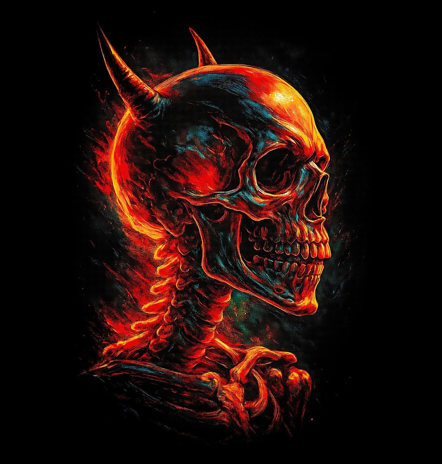 Dámské tričko Lebka Ďábla. Temnota, oheň a čistá síla zkázy – tento výrazný motiv zachycuje kostlivec v jeho nejděsivější podobě. Žhnoucí lebka s ďábelskými rohy symbolizuje přechod mezi světem živých a peklem, kde vládne chaos a nezkrotná energie. Kostlivec zde nepůsobí jen jako pozůstatek smrti, ale jako samotný ďábel v podobě, která nahání respekt i strach.