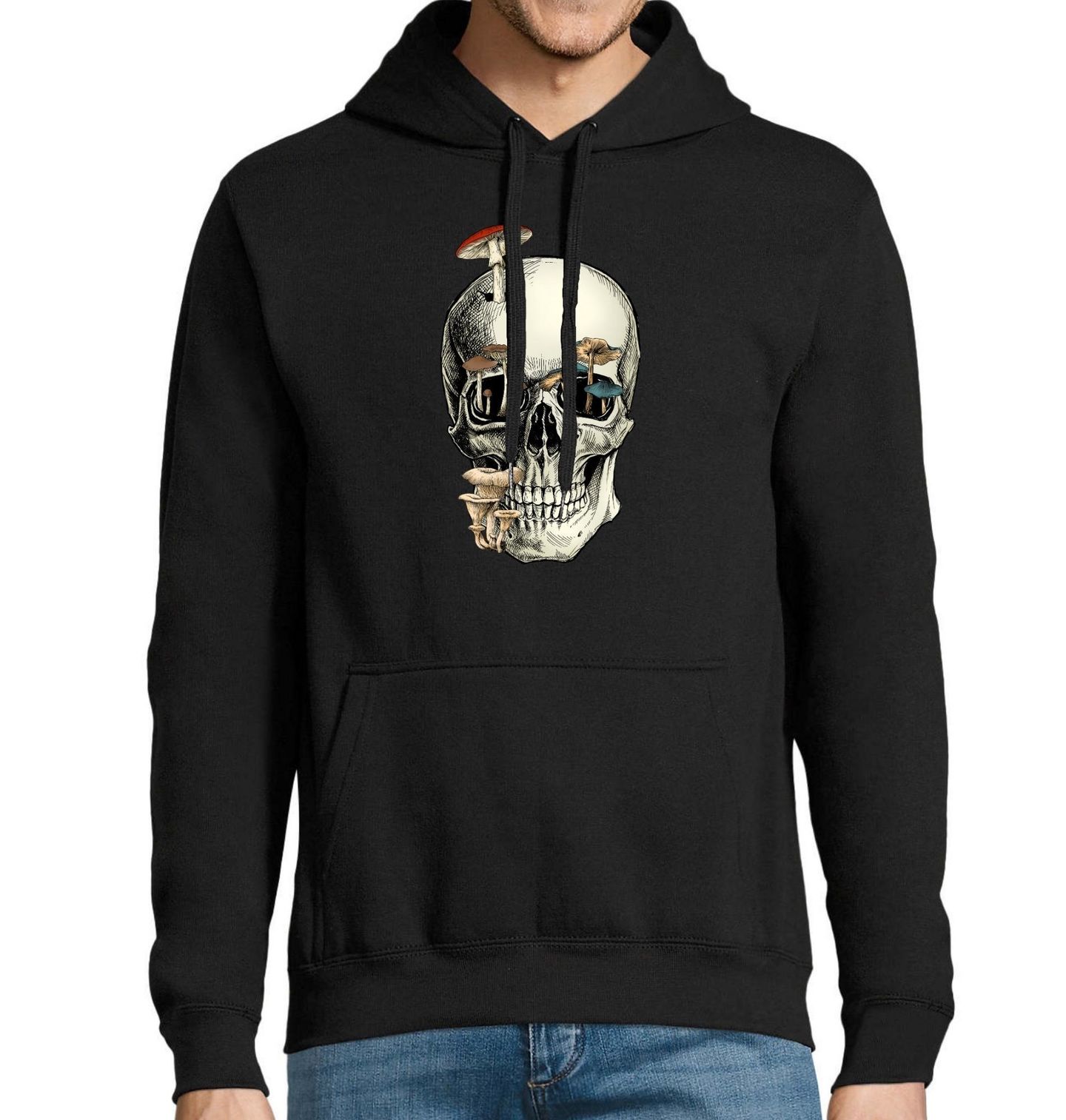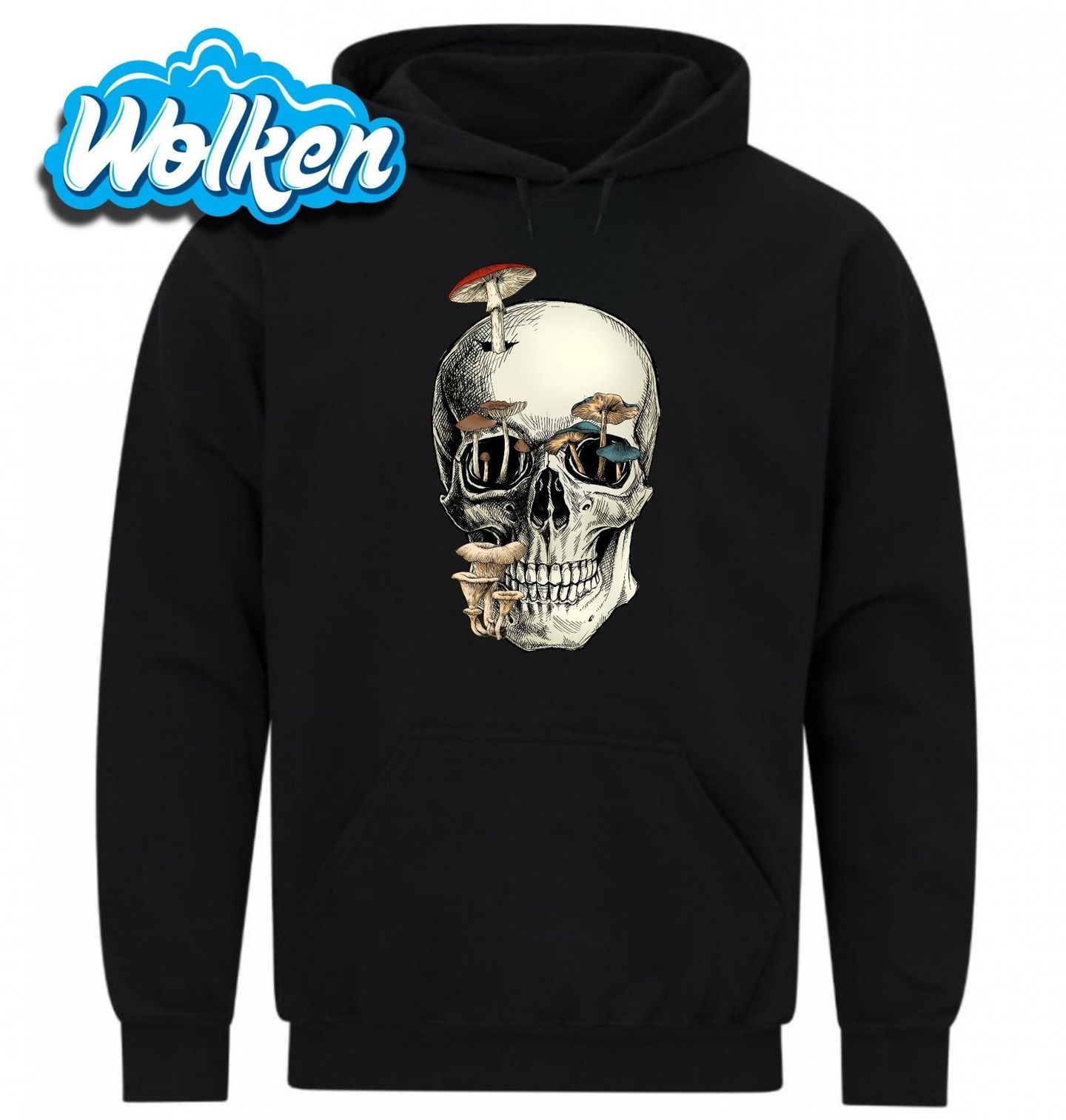 Pánská mikina Lebka Prorostlá Houbami. Mystický design lebky prorostlé houbami je dokonalou volbou pro milovníky temného umění, přírody a tajuplné atmosféry lesa. Pokud tě fascinuje spojení života a smrti, přírodní cyklus nebo prostě miluješ originální motivy, tento design je pro tebe jako stvořený.