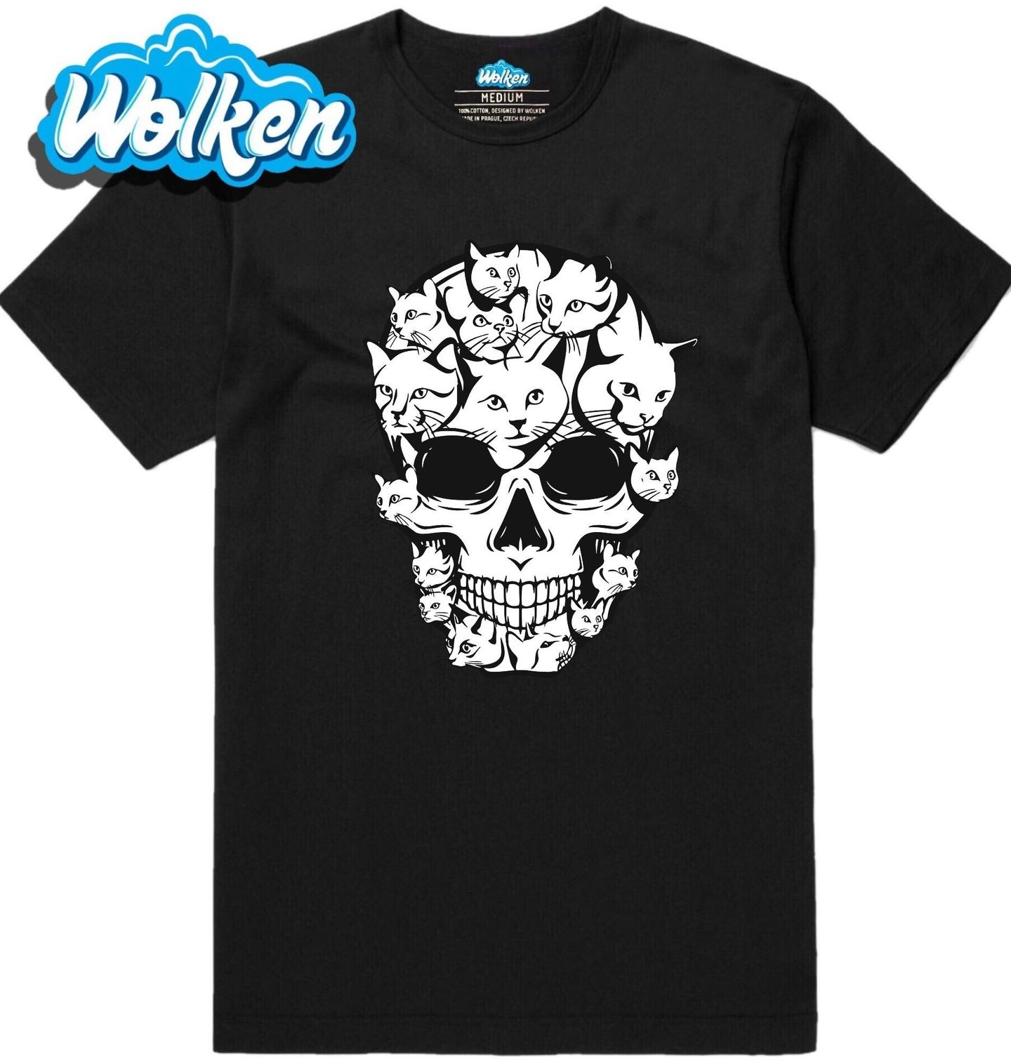 Pánské tričko Lebka z Koček. Lebka složená z desítek detailních obličejů – každá kočka přidává vrstvu tajemna, elegance i špetku šílenství. Tento originální design propojuje temnotu s roztomilostí, ať už jsi milovník gotiky, tetování, nebo jen prostě zbožňuješ kočky.