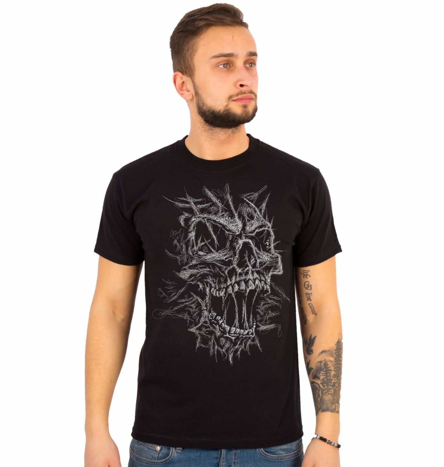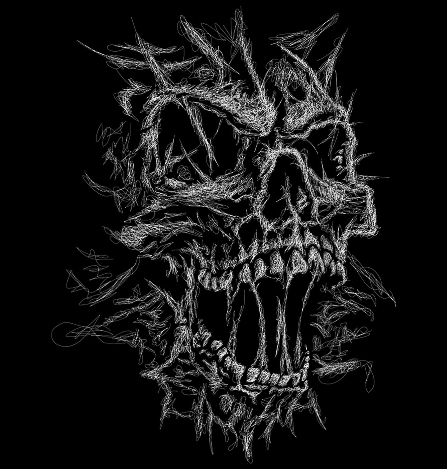 Pánské tričko Lebka Ztracené Duše Skica. Detailní kresba připomíná ručně načrtnuté tahy tužkou, které dohromady vytvářejí intenzivní výraz a ostré rysy. Lebka symbolizuje sílu, odvahu, nespoutanost i rebelii. Díky kontrastu bílé kresby na tmavém podkladu vynikne design na první pohled a dodá outfitu výrazný charakter.