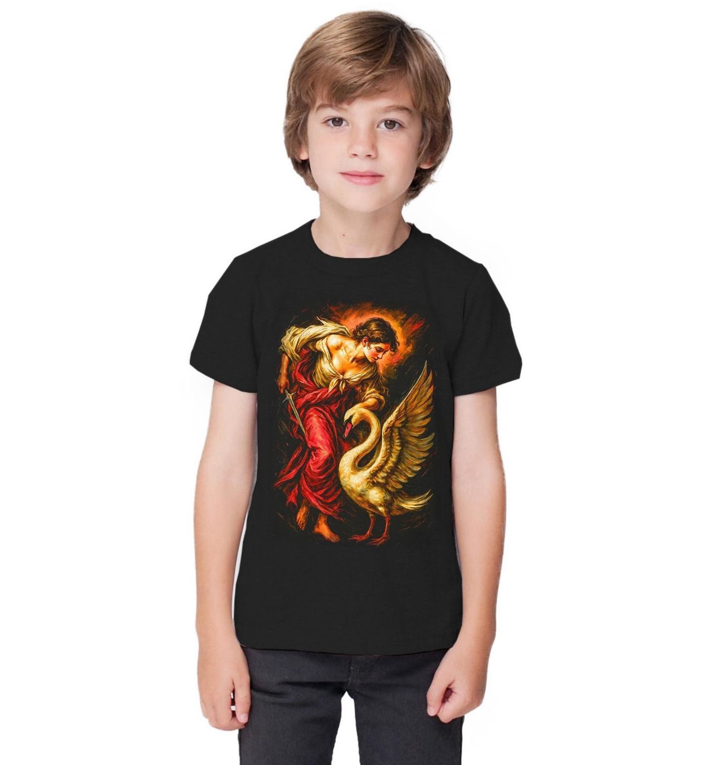 Dětské tričko Léda a Labuť. Tento výrazný motiv zachycuje dramatickou scénu z příběhu, který proslavila řecká mytologie – setkání krásné Léda s labutí, za jejíž podobou se skrýval samotný Zeus. Symbolika labutě zde představuje božskou moc, osud i proměnlivost bohů, kteří často zasahovali do lidských životů. Jsou často zobrazováni v intimní scéně proto, že samotný mýtus o Lédě a labuti je příběhem o svádění a spojení Dia (v podobě labutě) s Lédou.
