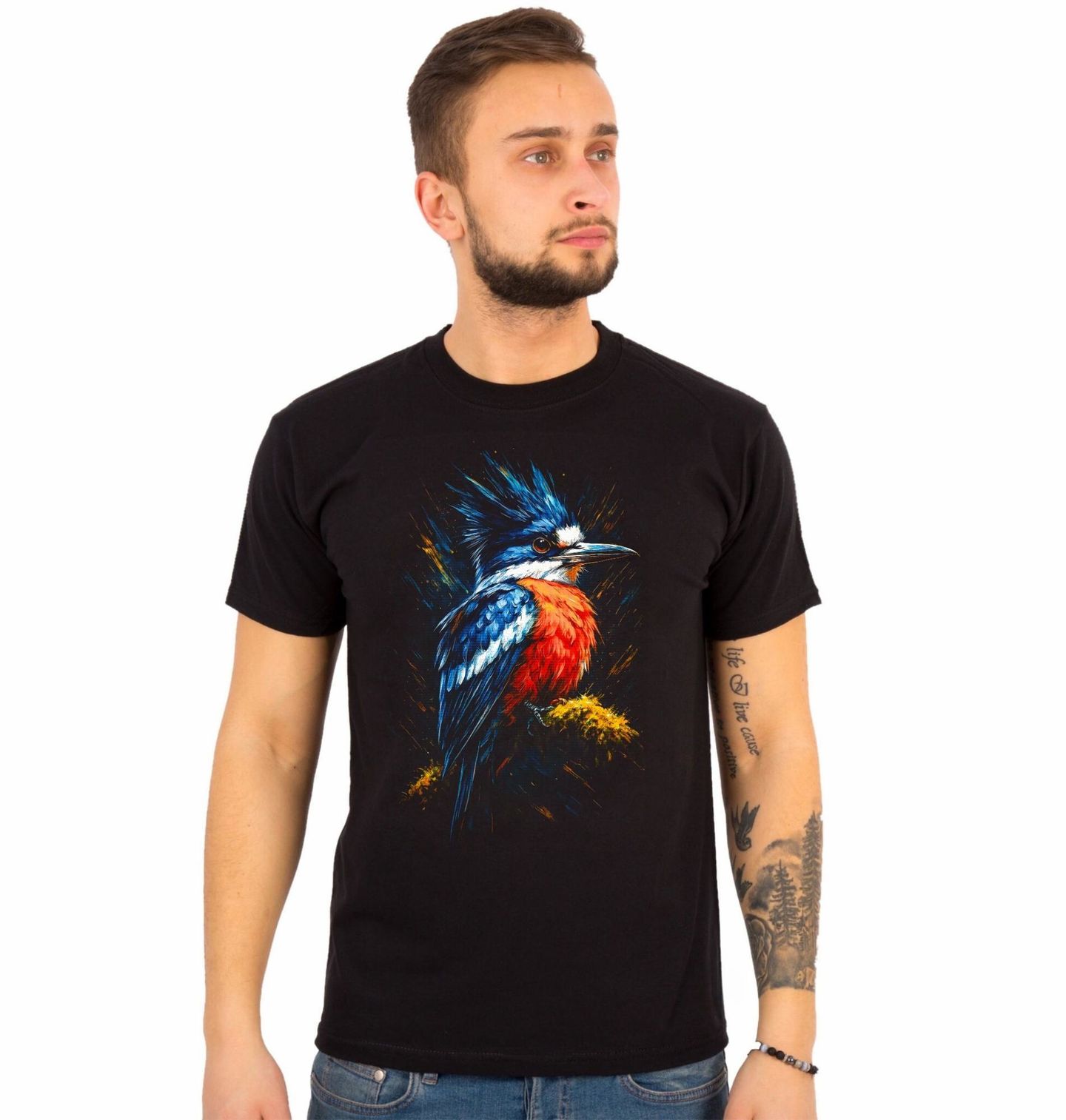 Pánské tričko Ledňáček chocholatý. Dynamický motiv zachycuje výrazný pták ledňáček chocholatý, fascinující druh známý svým ostrým zobákem, výraznou chocholkou a kontrastním zbarvením. Tento pták patří mezi oblíbené exotické druhy díky své energii, rychlosti a typickému vzhledu, který vyniká na každém designu.