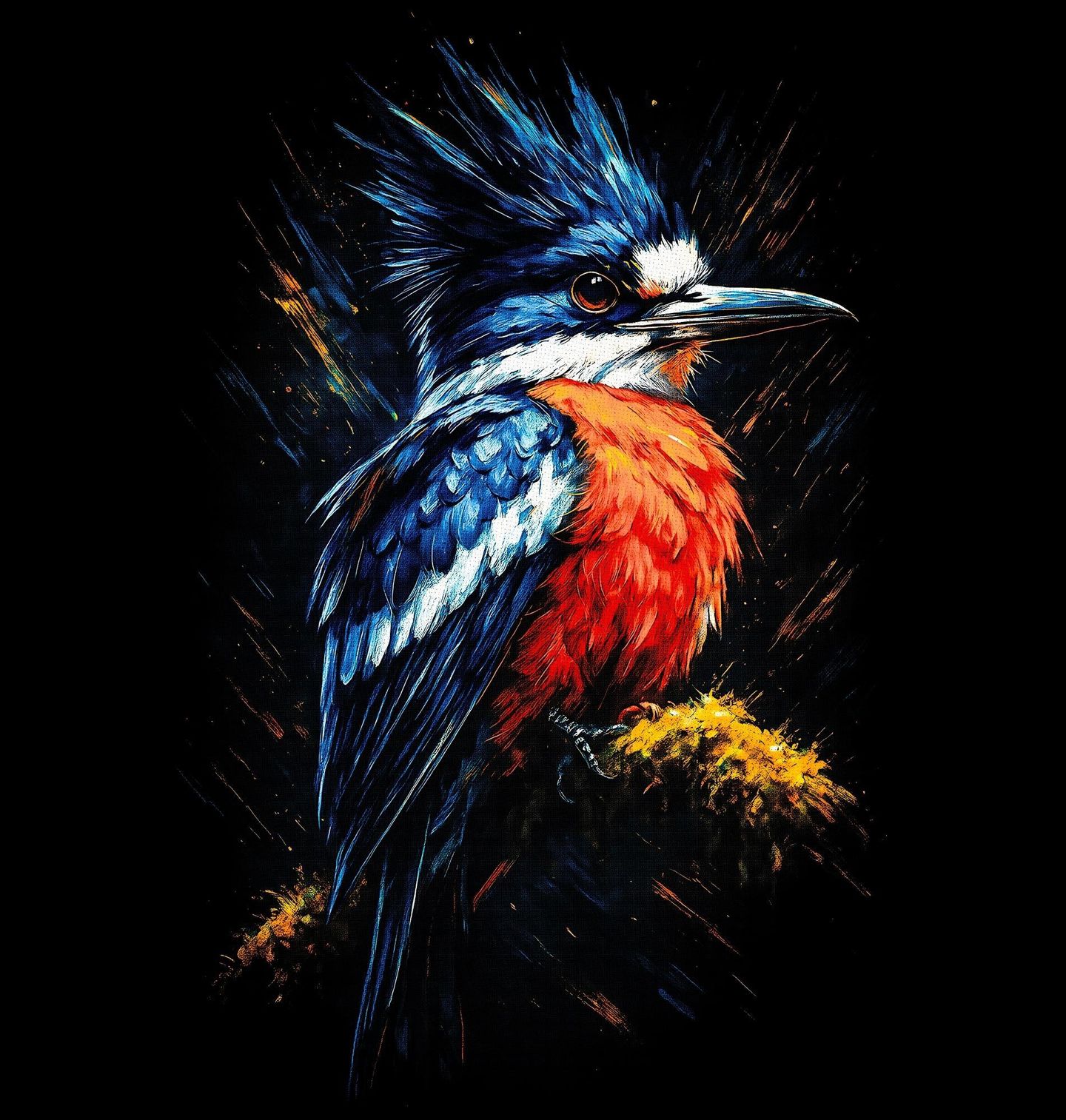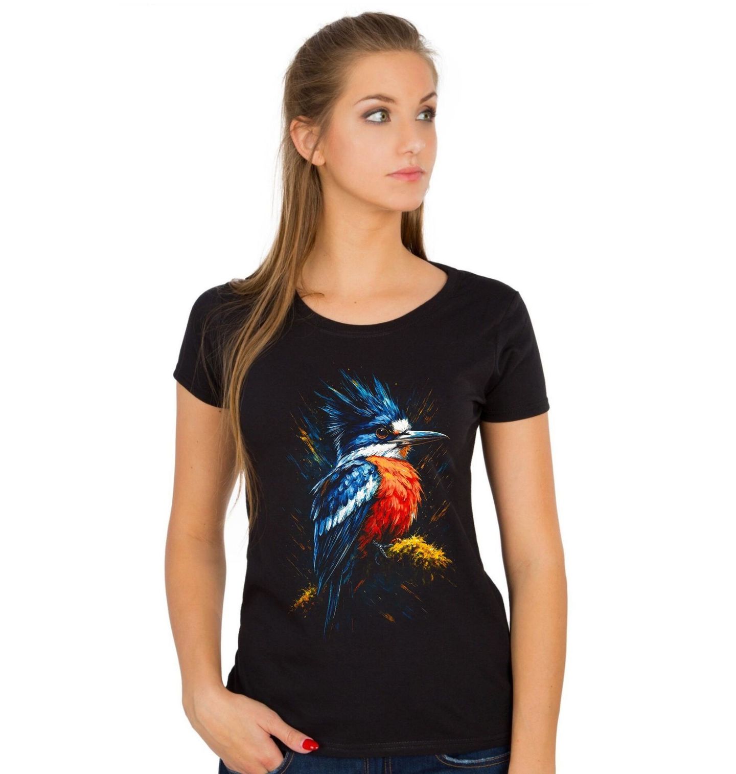 Dámské tričko Ledňáček chocholatý. Dynamický motiv zachycuje výrazný pták ledňáček chocholatý, fascinující druh známý svým ostrým zobákem, výraznou chocholkou a kontrastním zbarvením. Tento pták patří mezi oblíbené exotické druhy díky své energii, rychlosti a typickému vzhledu, který vyniká na každém designu.