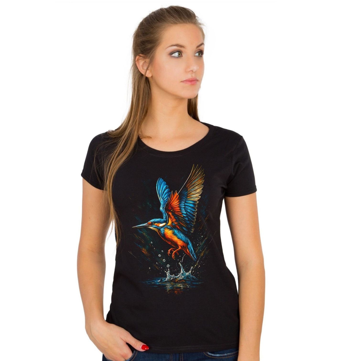 Dámské tričko Ledňáček říční. Ledňáček říční je pták symbolizující soustředění, obratnost a dokonalé načasování. Motiv kombinuje realistické detaily s uměleckým, lehce abstraktním stylem, který zdůrazňuje kontrast mezi tmavým pozadím a zářivými barvami peří i vody.