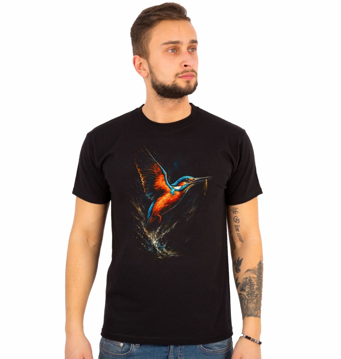 Pánské tričko Ledňáček říční na Lovu. Tento dynamický motiv zachycuje nádherného ptáka při lovu nad vodní hladinou. Pták je inspirovaný druhem ledňáček říční, který je známý svými zářivými modro-oranžovými barvami a rychlým pohybem při chytání ryb. Ledňáček říční patří mezi nejkrásnější a nejvýraznější ptáky evropské přírody a symbolizuje svobodu, energii a preciznost.