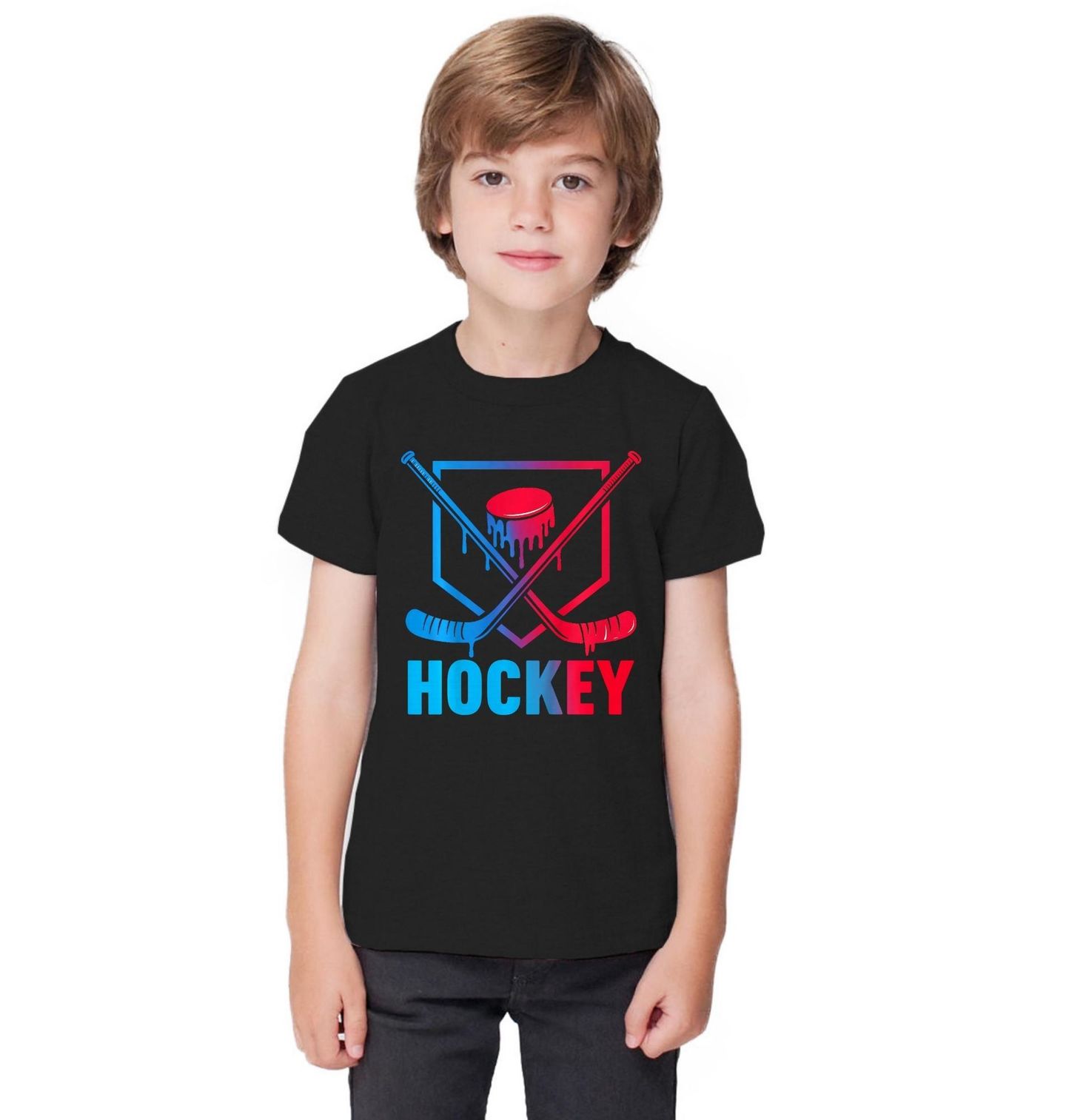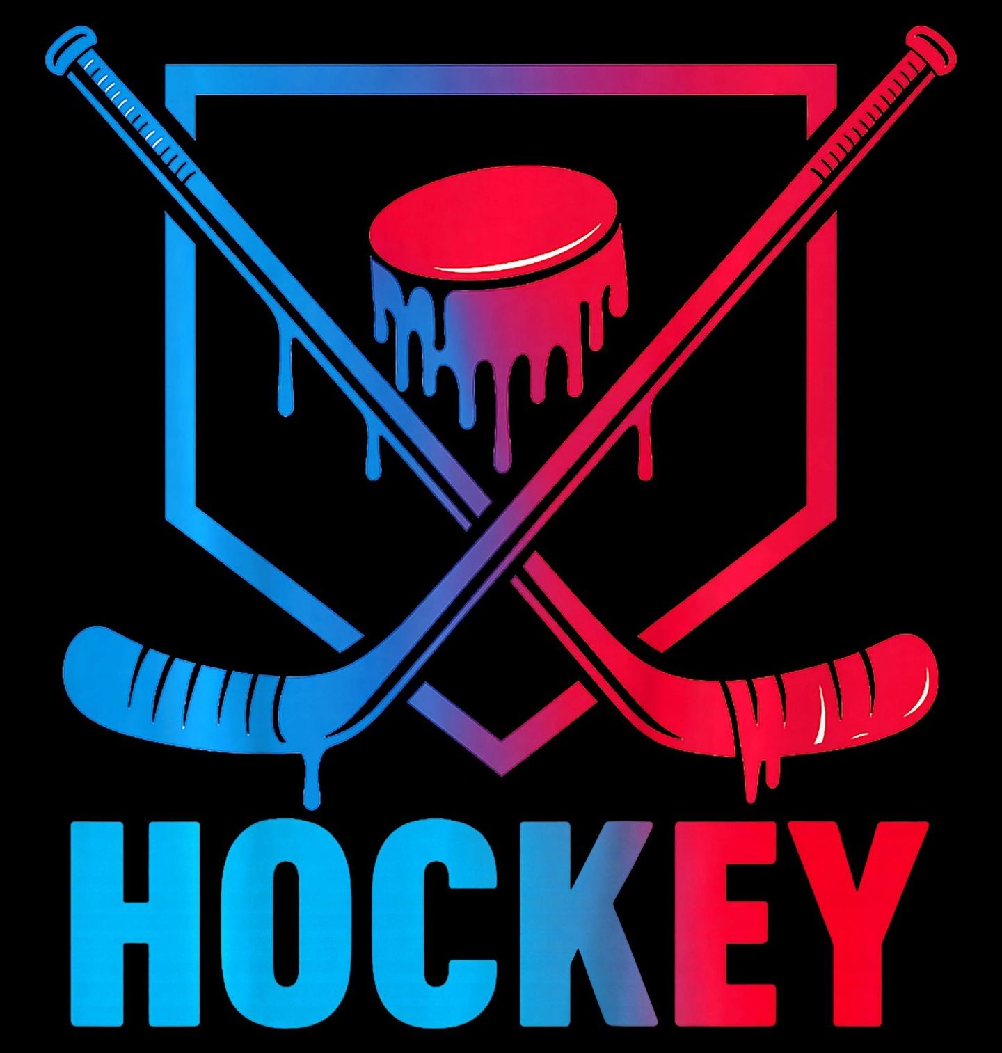Dětské tričko Ledový Hokej v Plamenech. Originální potisk Hockey v moderním barevném přechodu modré a červené barvy představuje ikonické hokejové symboly – puk a dvě zkřížené hokejky. Design je doplněn efektem stékající barvy, který dodává motivu energii a dynamiku.