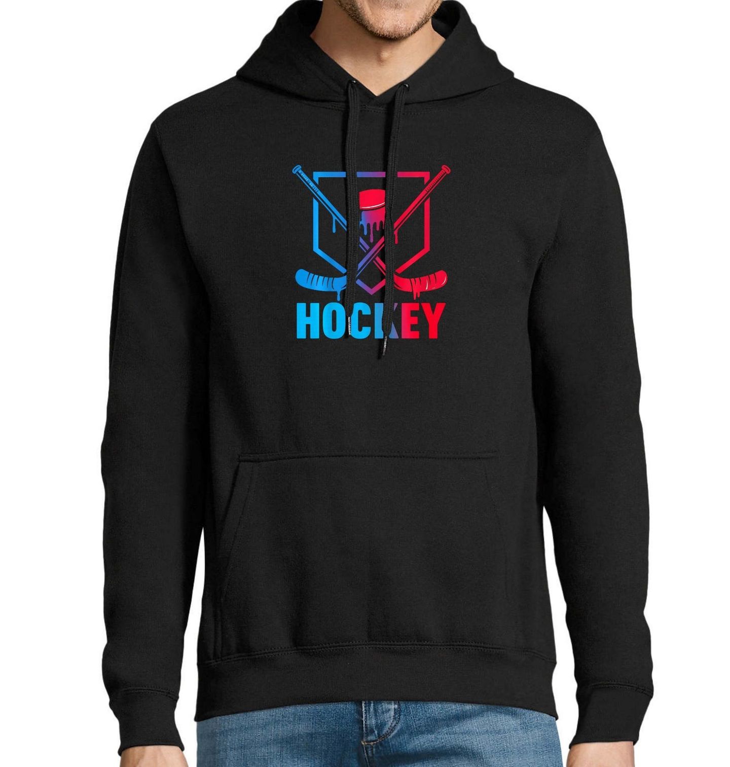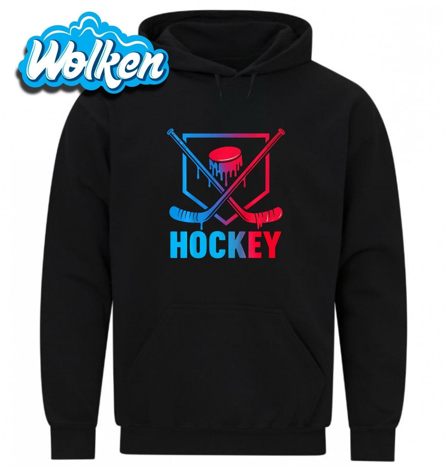 Pánská mikina Ledový Hokej v Plamenech. Originální potisk Hockey v moderním barevném přechodu modré a červené barvy představuje ikonické hokejové symboly – puk a dvě zkřížené hokejky. Design je doplněn efektem stékající barvy, který dodává motivu energii a dynamiku.
