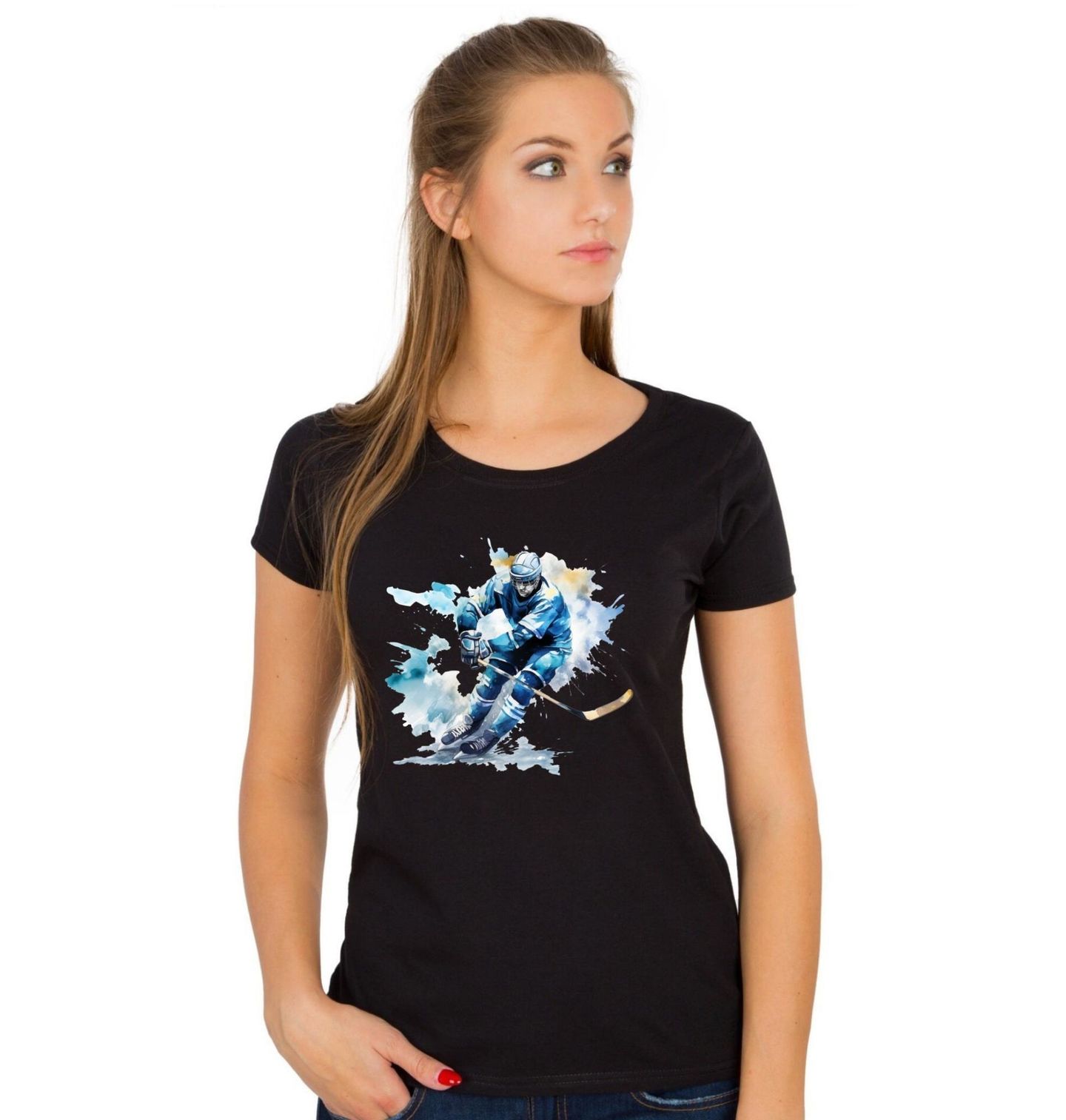 Dámské tričko Ledový Hokejista v Akci. Dynamický akvarelový motiv zachycující moment, kdy hokejista brázdí led v plné rychlosti. Modré a bílé tóny krásně vystihují atmosféru zimního stadionu a napětí, které přináší hokej jako rychlý a tvrdý sport. Tento motiv je ideální pro každého, kdo miluje energii, pohyb a led pod bruslemi – prostě srdcem i duší hokejista.