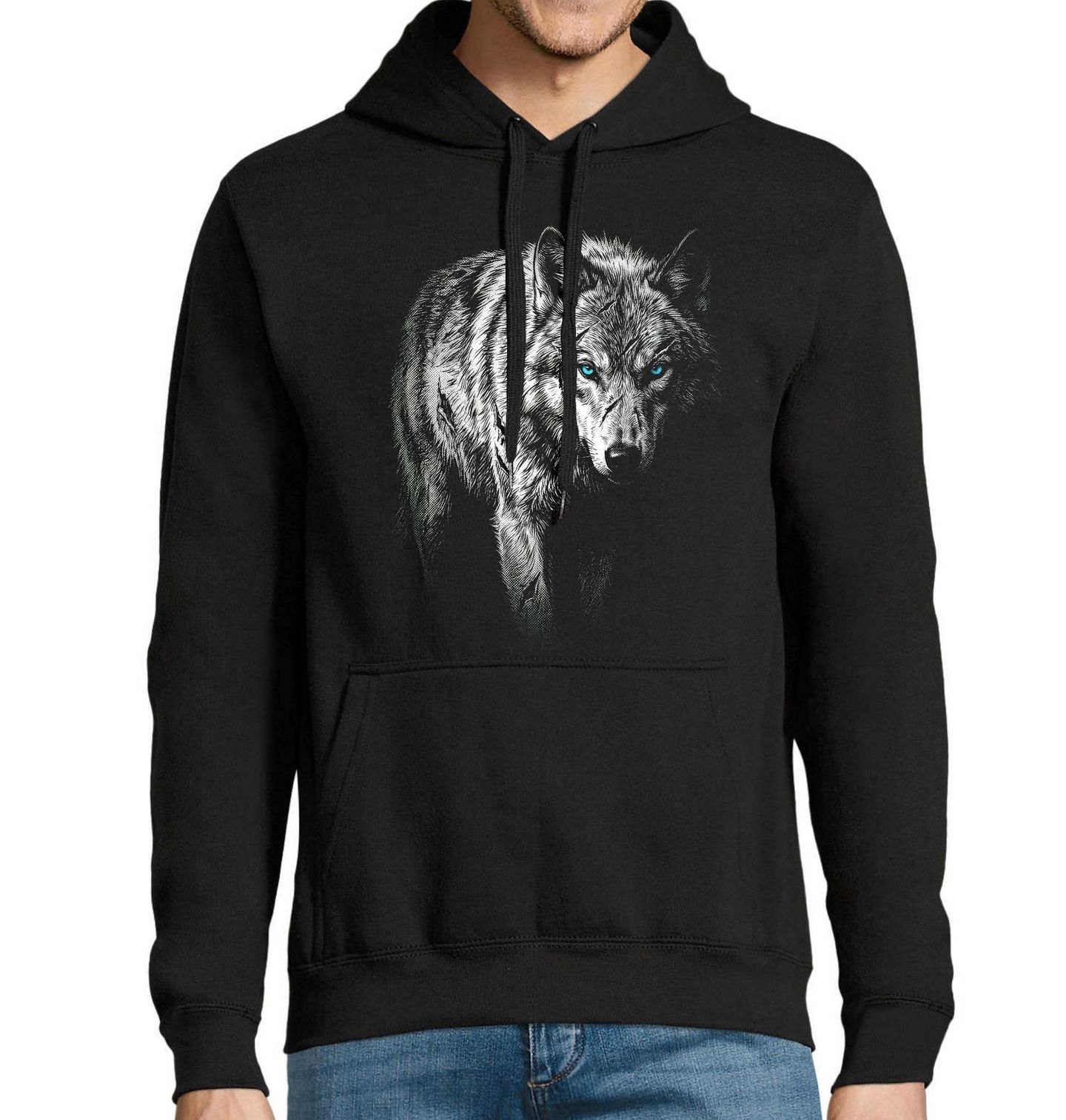 Pánská mikina Ledový Pohled Vlka. Silný a tajemný motiv, kde vlk vystupuje z temnoty s pronikavým, ledově modrým pohledem. Tento detailně zpracovaný design zachycuje vlk jako symbol síly, samostatnosti a nezkrotné divokosti. Motiv je ideální pro ty, kdo mají rádi divokou přírodu, sílu individuality a respekt k instinktům. Vlk v tomto provedení představuje odhodlání, vytrvalost a vnitřní sílu.