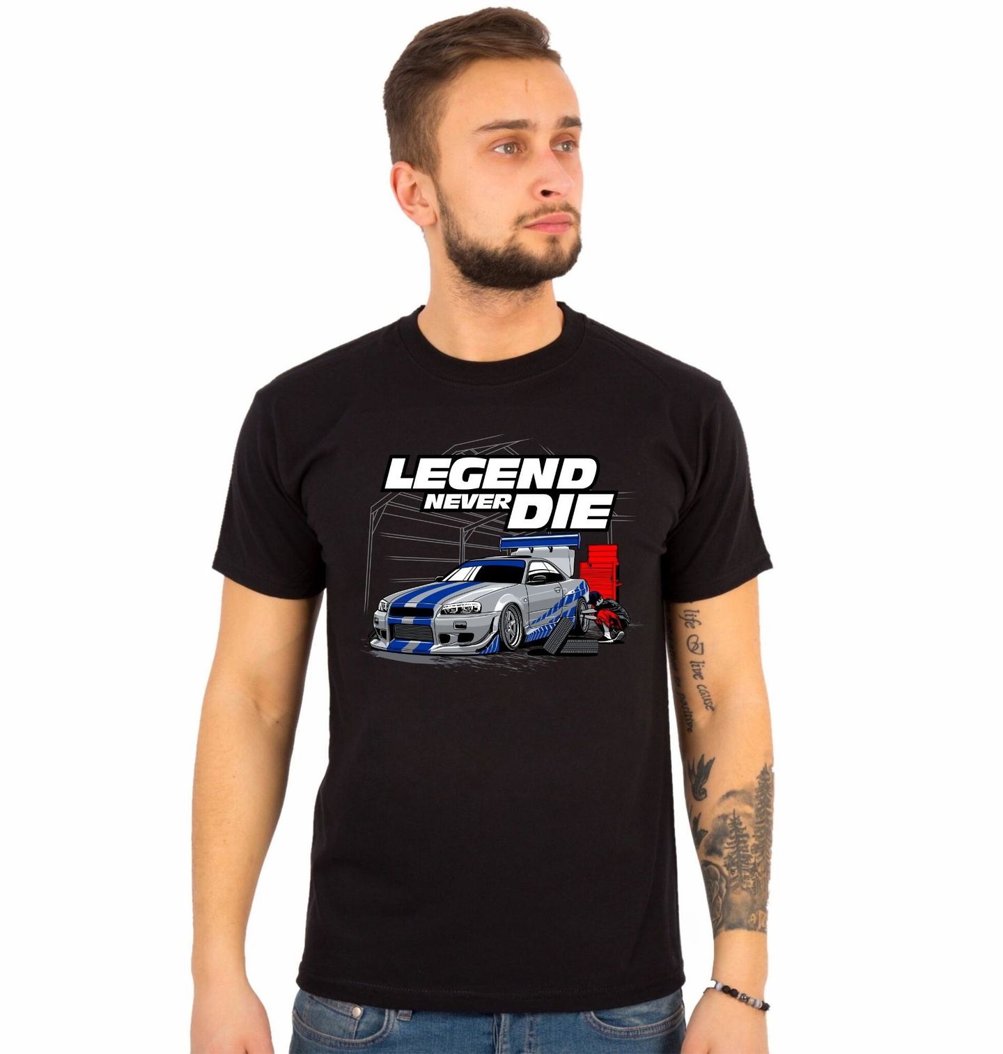 Pánské tričko Legend Never Die Skyline. Stylový motiv zachycuje ikonické japonské auto inspirované legendárním Nissan Skyline GT-R R34, který patří mezi nejznámější sportovní vozy, jaké kdy Japonsko vytvořilo. Agresivní bodykit, výrazné závodní pruhy a garážová atmosféra podtrhují charakter, který z tohoto modelu dělá skutečnou legendu mezi fanoušky JDM.