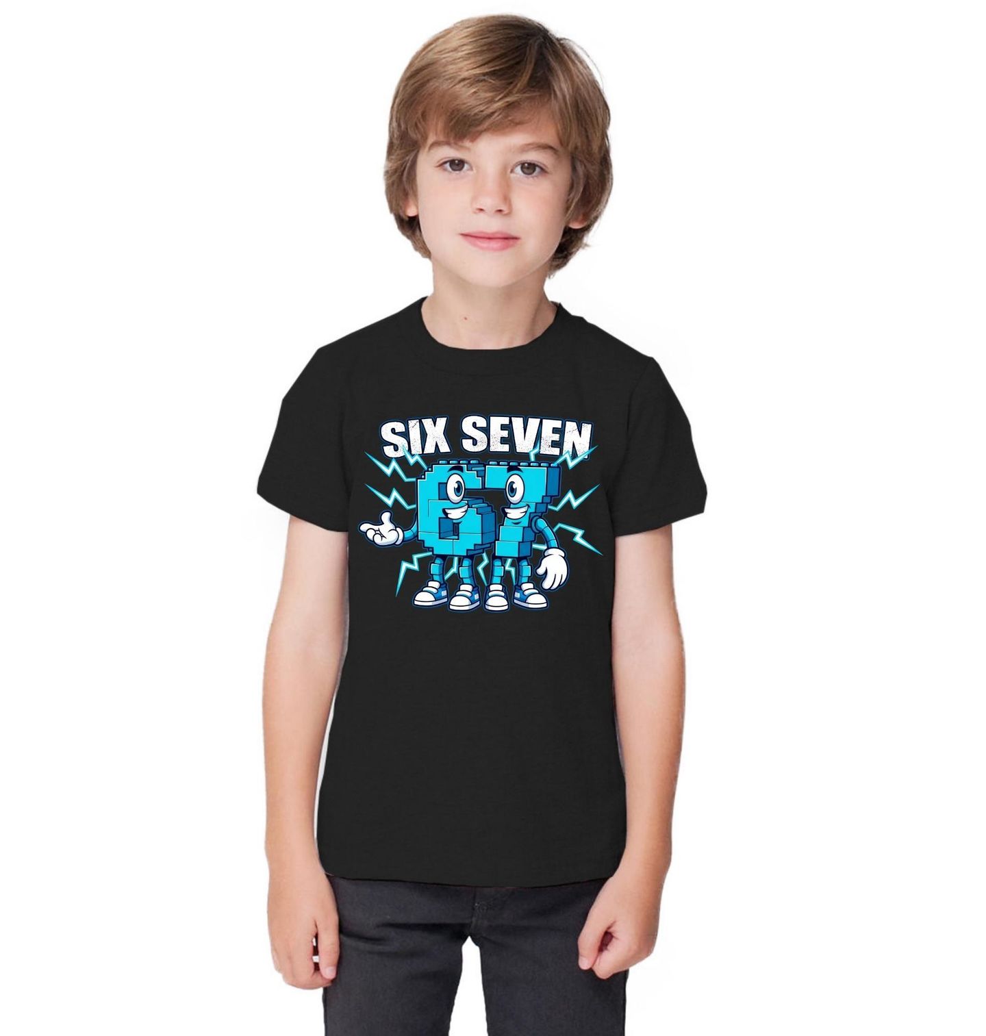 Dětské tričko Legendární Meme 67 Six Seven. Vtipný a hravý motiv 67 inspirovaný populárním six seven meme! Na obrázku jsou číslice 6 a 7 jako roztomilé postavičky s očima, rukama a botami, které stojí vedle sebe jako nejlepší parťáci. Nad nimi je anglický nápis „SIX SEVEN“, což znamená „ŠEST SEDM“.