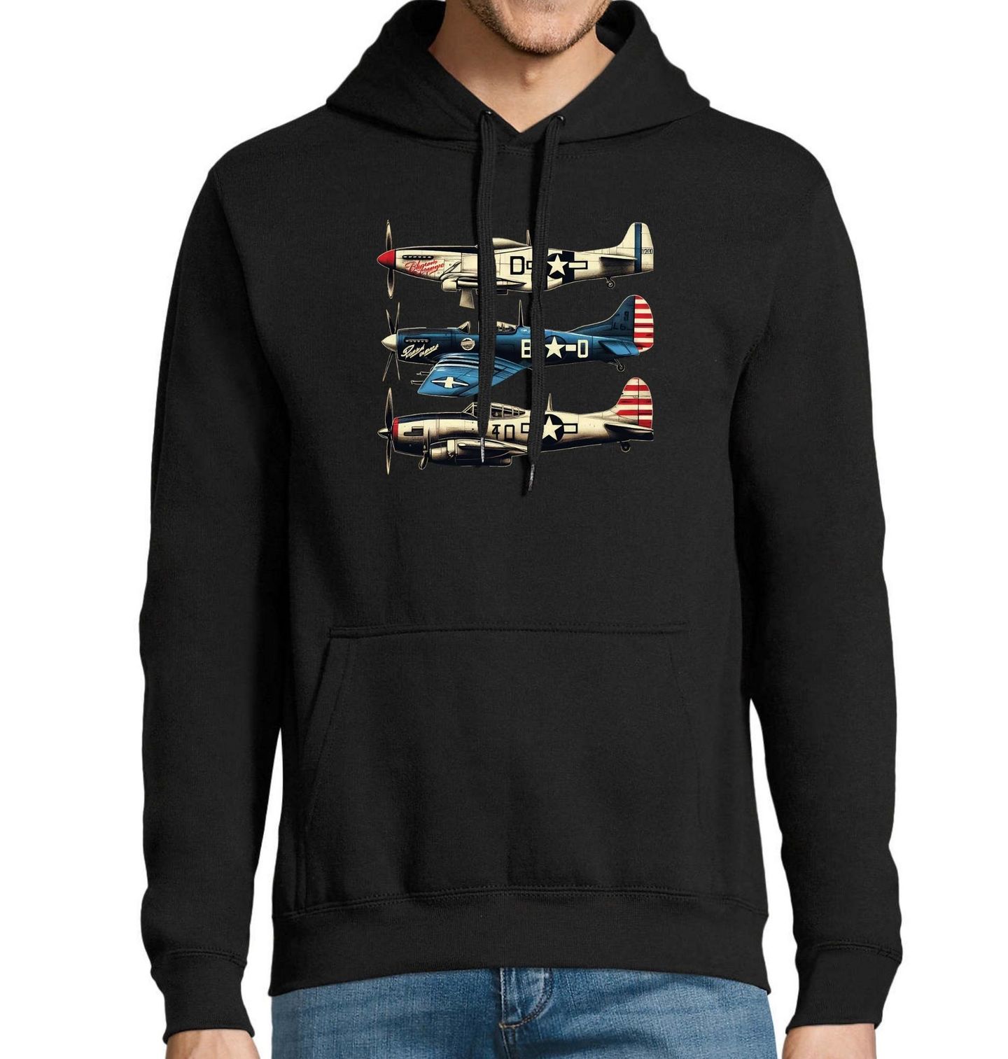 Pánská mikina Legendární Válečná Letadla. Horní: P-51 Mustang (stíhací letoun). Střední: Douglas SBD Dauntless (palubní střemhlavý bombardér). Dolní: Republic P-47 Thunderbolt (stíhací bombardér). Všechna tato letadla pocházejí z USA a byla klíčovou součástí amerického letectva a námořnictva během WW2.