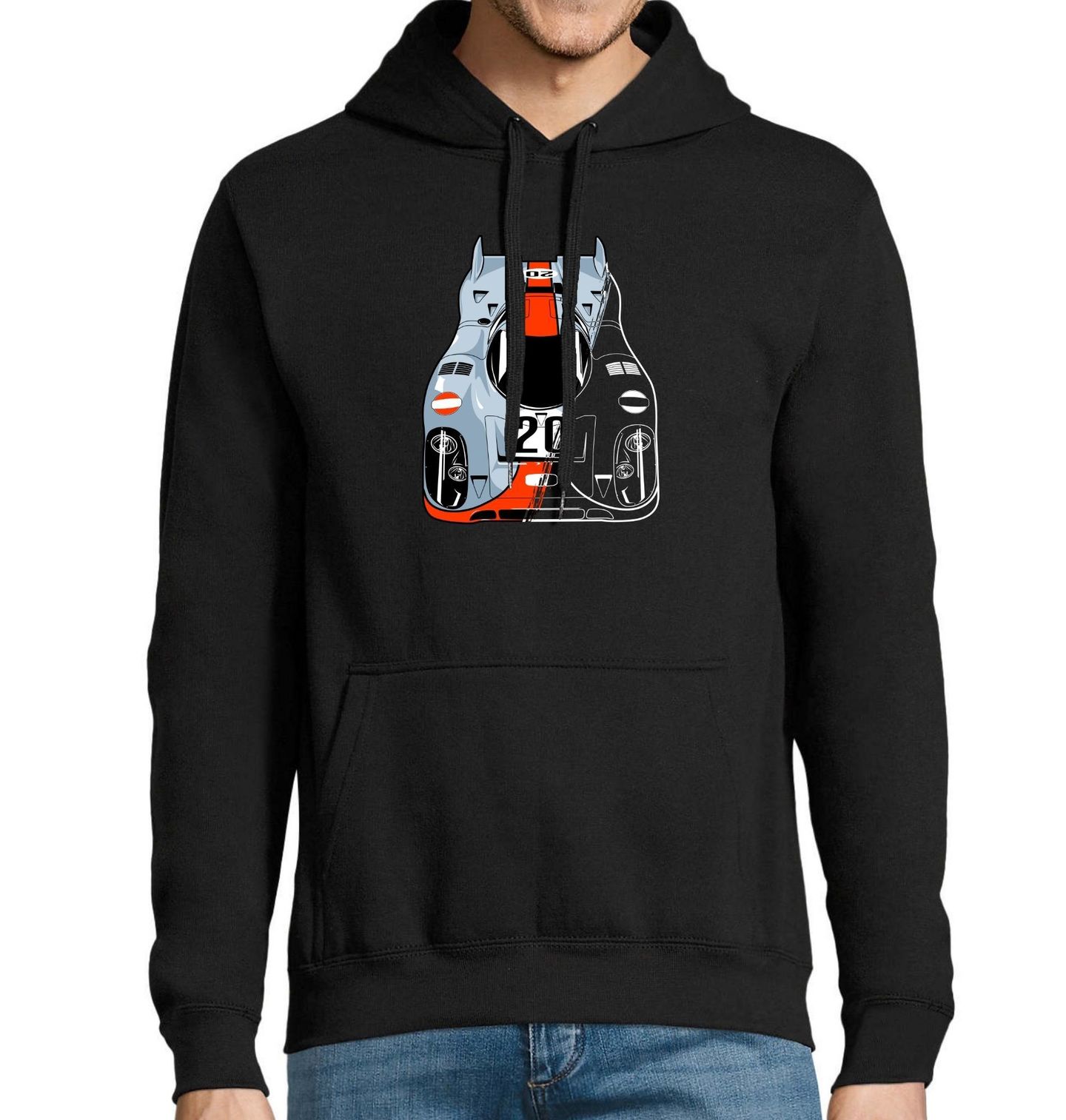 Pánská mikina Legendární Závodní Auto Porsche 917K. Tohle bylo jedno z nejslavnějších závodních aut historie Le Mans. Motiv zobrazuje ikonické závodní auto Porsche 917K v legendárních barvách Gulf s číslem 20, které se nesmazatelně zapsalo do historie vytrvalostních závodů 24 hodin Le Mans na přelomu 60. a 70. let. Tento vůz patří mezi nejslavnější prototypy motorsportu. Verze 917K (Kurzheck = krátký zadek).