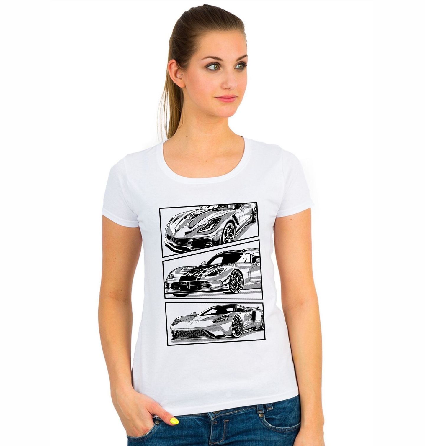 Dámské tričko Legendy Výkonu. Tento výrazný motiv zachycuje ikonické sportovní auto v dynamickém komiksovém zpracování. Nahoře je Chevrolet Corvette (C7) – americké sportovní auto s atmosférickým osmiválcem. Uprostřed je Dodge Viper (5. generace) – brutální americké auto s ikonickým desetiválcem. A dole je Ford GT (nová generace) – moderní supersportovní auto inspirované Le Mans závodní historií.