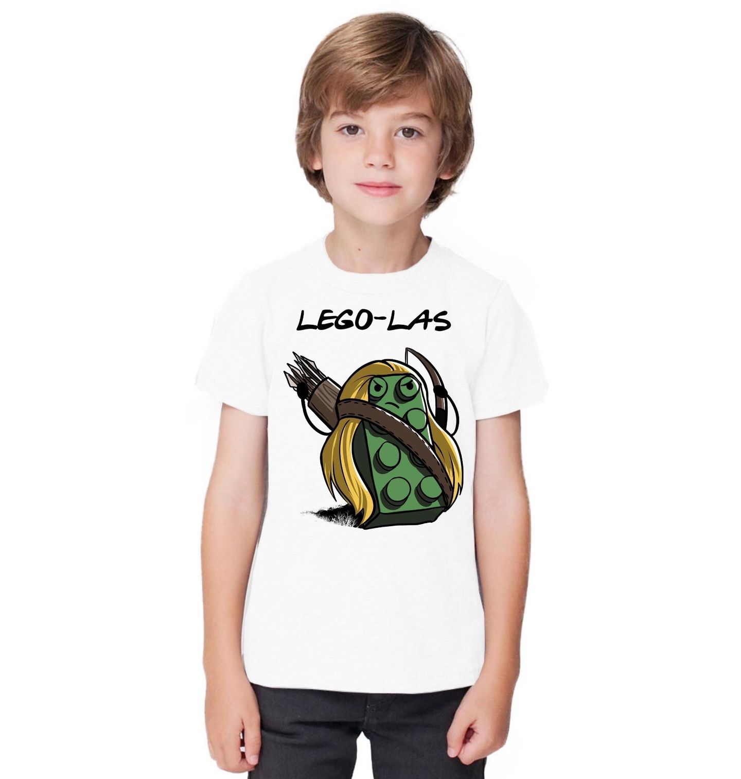 Dětské tričko Lego-las Lukostřelec. Vtipný design kostky inspirovaný fantasy světem představuje postavu s lukem a šípy s názvem „Lego-las“. Jde o hravou parodii na slavného elfího lukostřelce, která kombinuje fantasy styl a ikonickou stavebnicovou kostku.