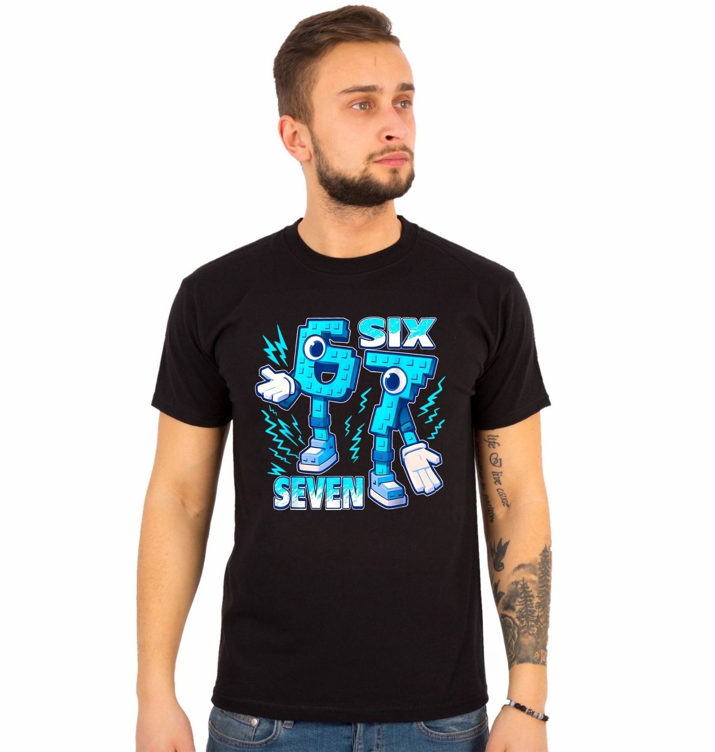 Pánské tričko Lego Postavičky 67 Six Seven. Originální motiv 67 ve stylu six seven meme, kde jsou čísla 6 a 7 zpracovaná jako modré LEGO figurky s očima, rukama a botami. Číslice 67 působí, jako by byly postavené z kostek, a doplňují je blesky, které dodávají energii a výrazný meme vzhled. Skvělý design pro fanoušky humoru, čísla 67 i hravého LEGO stylu.
