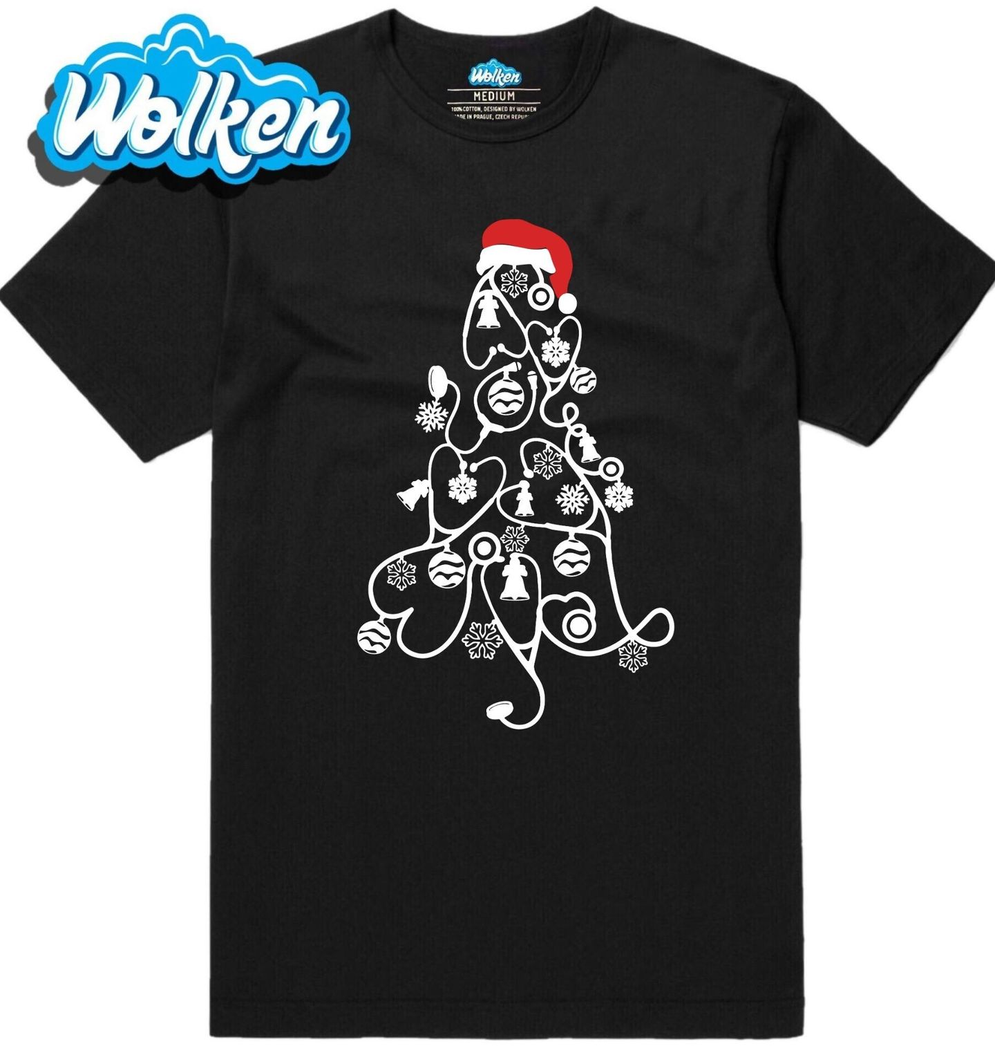 Pánské tričko Lékařský Stromeček v Ordinaci. Vánoční stromeček je tvořený liniemi připomínajícími stetoskop a ozdobený typickými vánočními dekoracemi – kouličkami, vločkami a zvonečky. Na vrcholu se vyjímá červená čepice Santa Clause. Tento design je ideální dárek pro každého, kdo pracuje ve zdravotnictví – ať už je to lékař, doktor, sestřička nebo zdravotník, který miluje Vánoce.