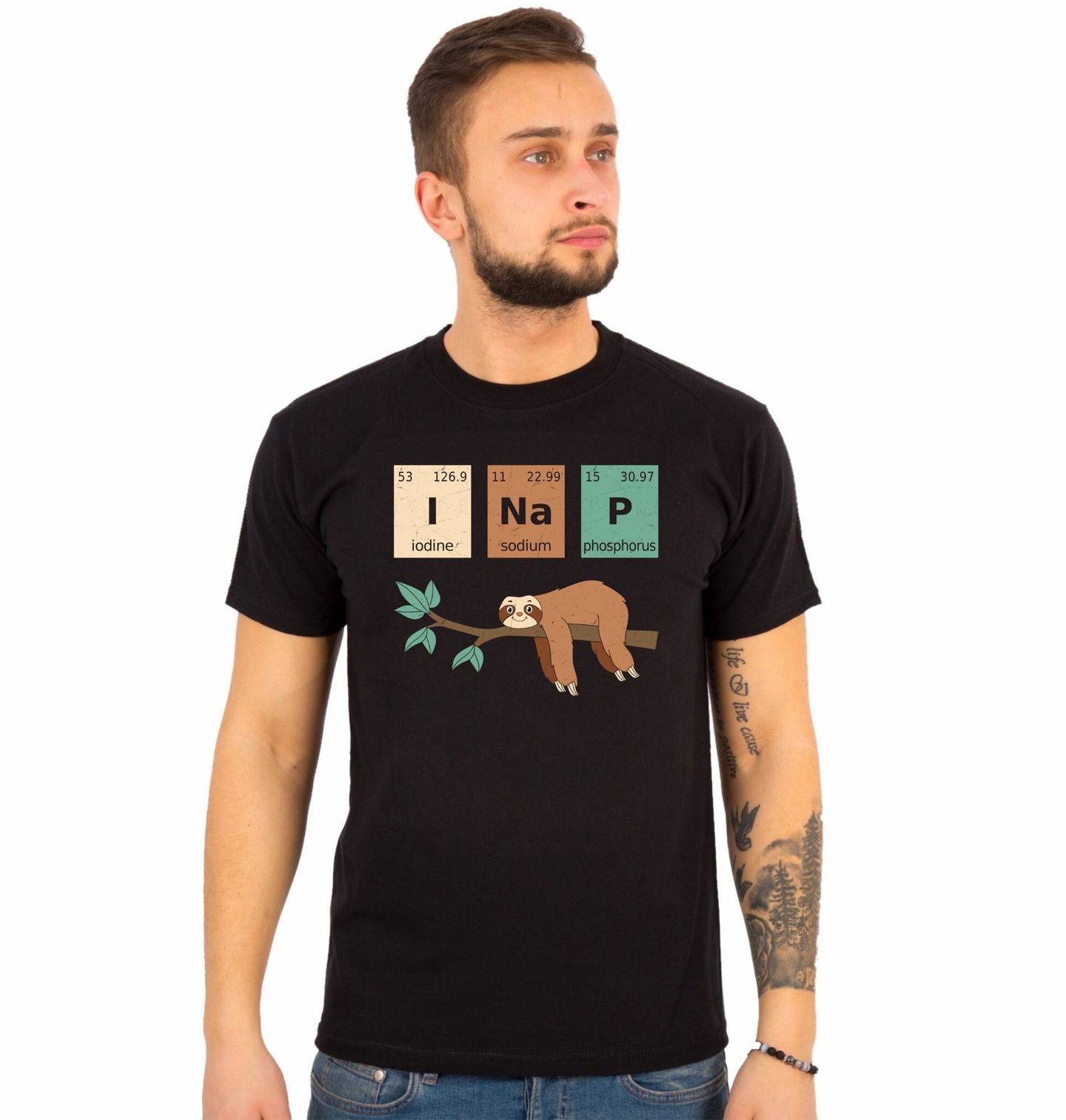 Pánské tričko Lenochod Chemické Prvky I NaP. Originální design spojuje chemii a humor – prvky jód (iodine), sodík (sodium) a fosfor (phosphorus) vytvářejí nápis „I NaP“, zatímco roztomilý lenochod odpočívá na větvi. Tento design je ideální pro všechny, kdo milují klid, pohodu a vtipné slovní hříčky inspirované vědou.