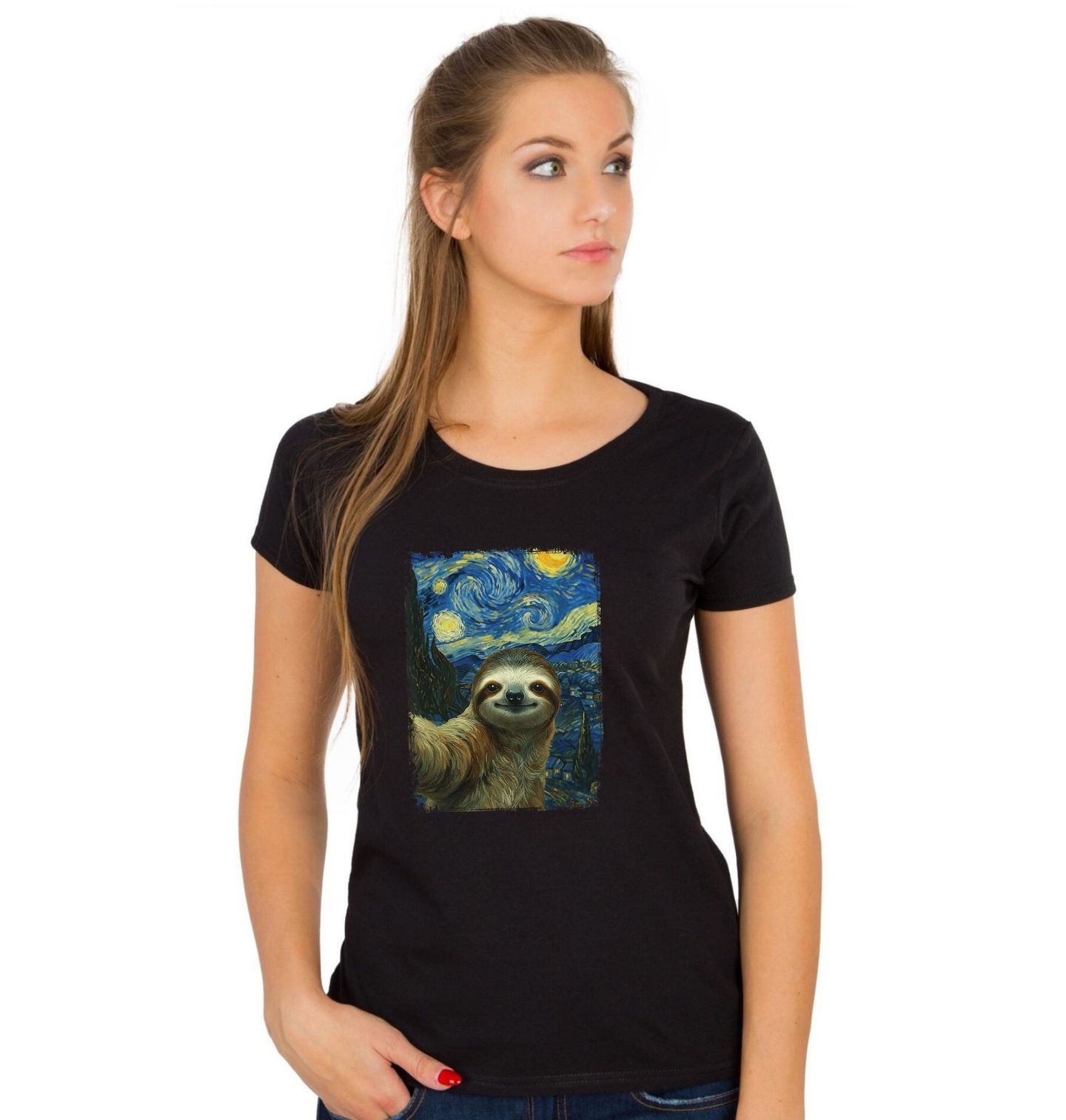 Dámské tričko Lenochod ve Hvězdné noci. Originální a vtipný motiv, ve kterém se usmívající lenochod fotí „selfíčko“ na pozadí legendárního obrazu Hvězdná noc. Celý design je výtvarně laděný tak, aby připomínal charakteristický styl malíře Vincent van Gogh, což vytváří dokonalé spojení humoru, umění a roztomilosti.