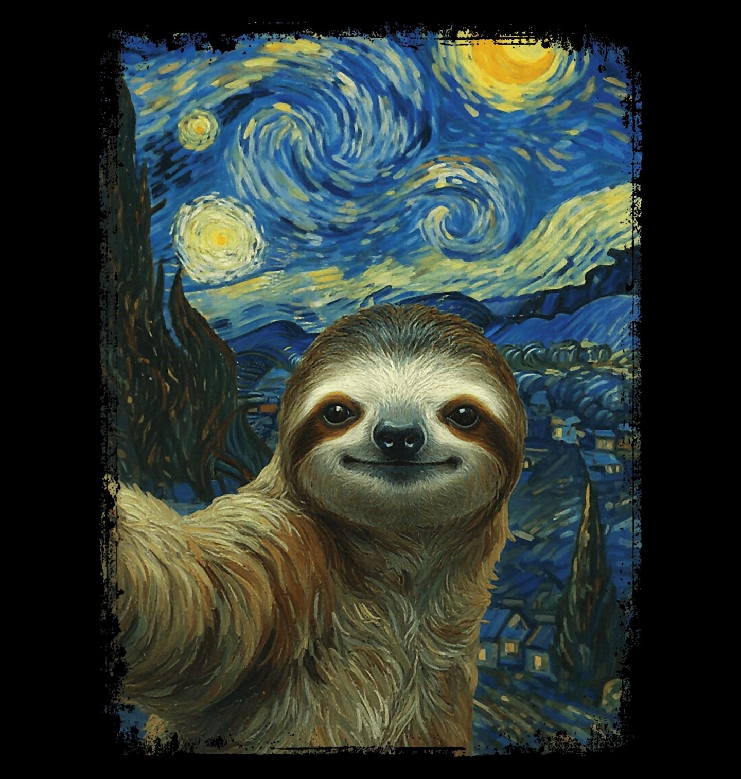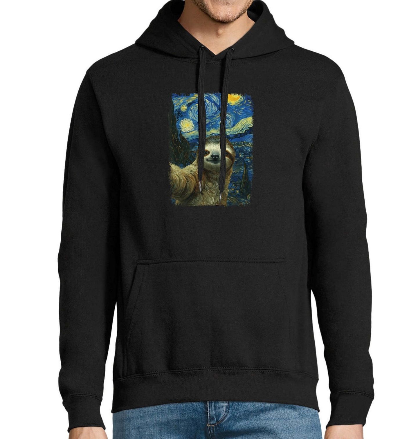 Pánská mikina Lenochod ve Hvězdné noci. Originální a vtipný motiv, ve kterém se usmívající lenochod fotí „selfíčko“ na pozadí legendárního obrazu Hvězdná noc. Celý design je výtvarně laděný tak, aby připomínal charakteristický styl malíře Vincent van Gogh, což vytváří dokonalé spojení humoru, umění a roztomilosti.