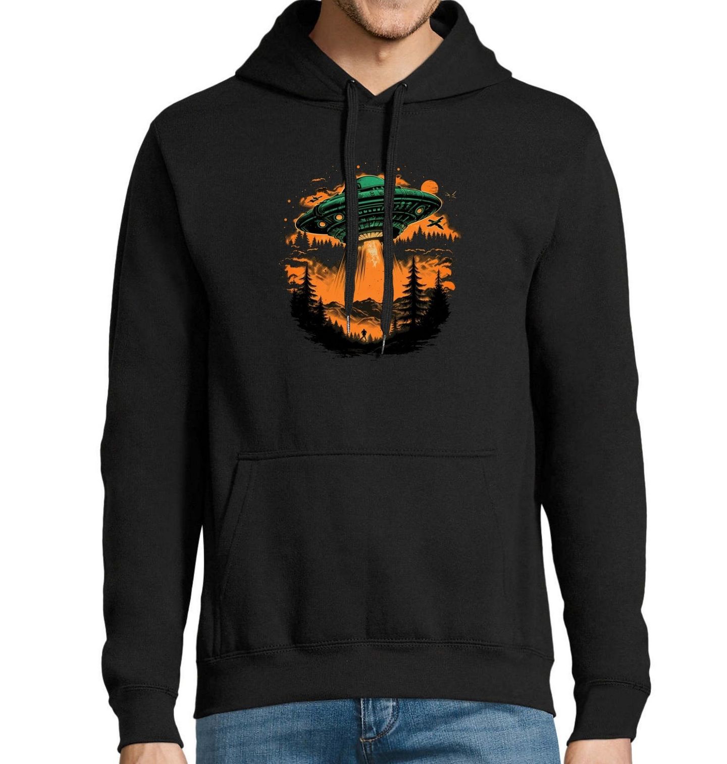 Pánská mikina Les pod palbou UFO invaze. UFO – zářivě zelený létající talíř, který přistává v potemnělém lese zalitém oranžovým světlem. Z paprsku světla vystupuje mimozemšťan, zatímco v pozadí se vznáší stíny hor, stromů a noční oblohy. Celý motiv působí jako výjev z retro sci-fi filmu, kde se neví, zda přichází přátelé nebo hrozba.