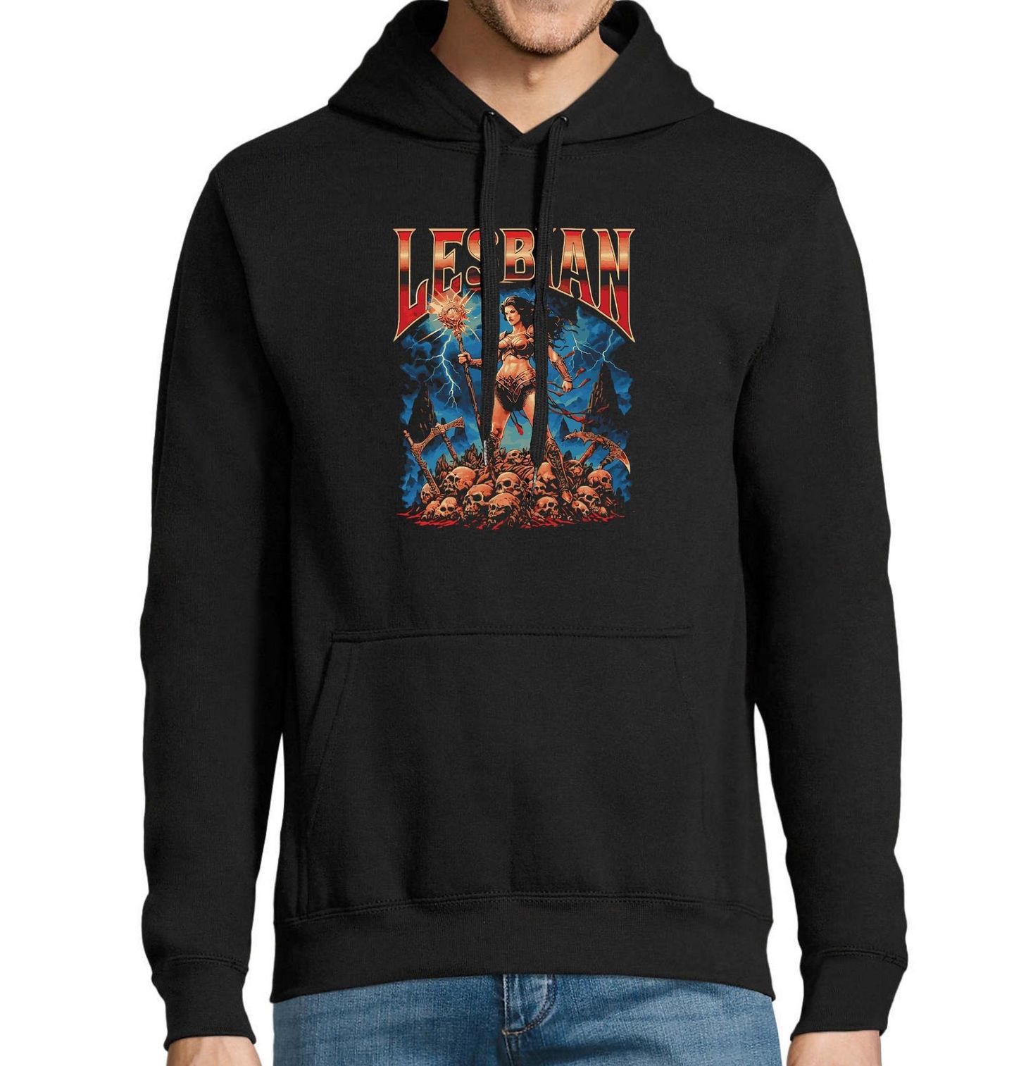 Pánská mikina Lesbická Válečnice Lesbian Warrior. Tričko s bojovnicí a lebkami přináší drsný fantasy motiv bojovnice inspirované ikonickými hrdinkami typu Xena. Silná a hrdá lesba stojí na hromadě lebek poražených nepřátel, obklopená blesky a temným nebem. Ideální pro všechny, kdo chtějí vyjádřit svou identitu a zároveň milují silné ženské postavy.