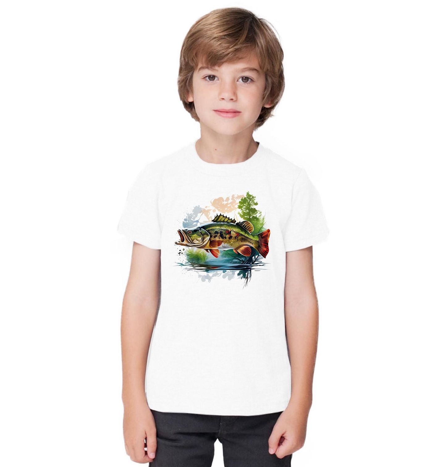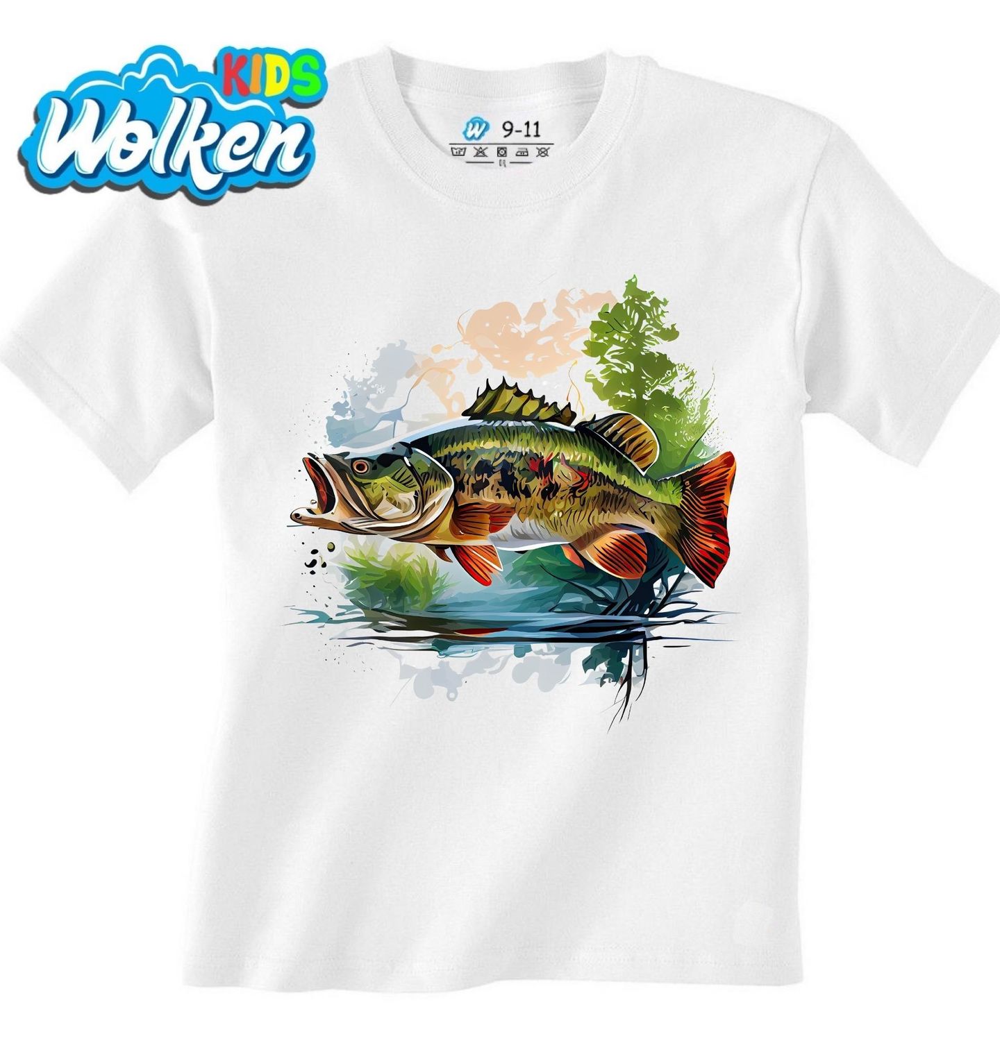 Dětské tričko Lesní dravec Okoun. Tato akční ilustrace zachycuje dravého okounovce velkoústého ve chvíli útoku – v srdci přírody, mezi stromy a klidnou hladinou. Perfektní design pro každého rybáře, který miluje sportovní rybaření, přívlač a lov v přírodních jezerech.