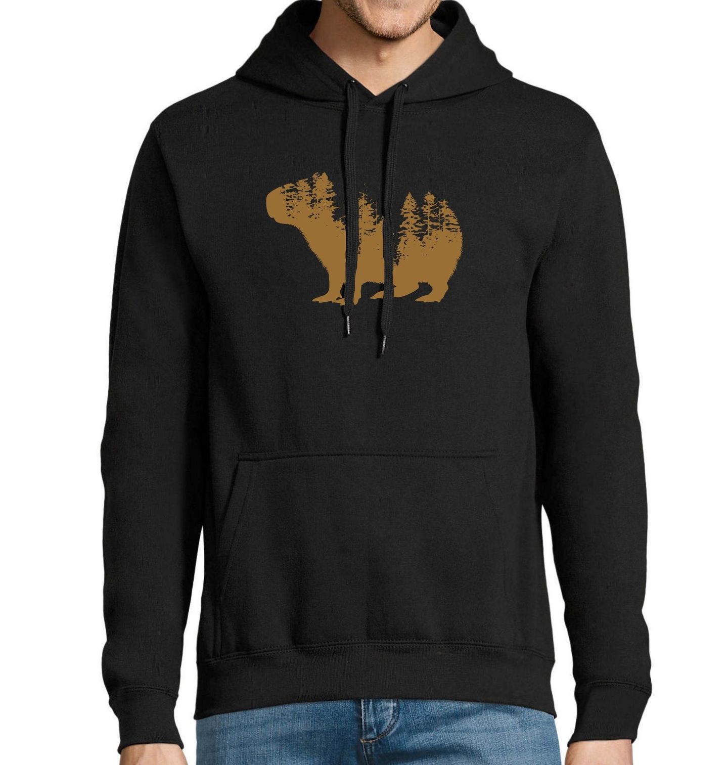 Pánská mikina Lesní Kapybara. Kapybara, největší hlodavec na světě, jako součást hlubokého lesa – symbol klidu, síly a harmonie s přírodou. Kapybara v této umělecké kompozici působí jako strážce lesa, ztělesnění klidu a vyrovnanosti. Ideální pro milovníky přírody a zvířat.