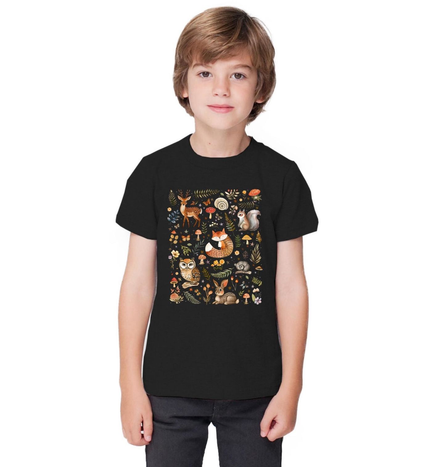Dětské tričko Lesní Parta Zvířátek. Rozkošný ilustrativní motiv plný lesní pohody! Hlavními hrdiny jsou liška, sova, veverka, králík, jelen a celá řada dalších lesních přátel – nechybí ani barevné houby, květiny, motýli nebo šneci. Motiv je jako stvořený pro milovníky přírody, zvířat a pohádkových ilustrací.