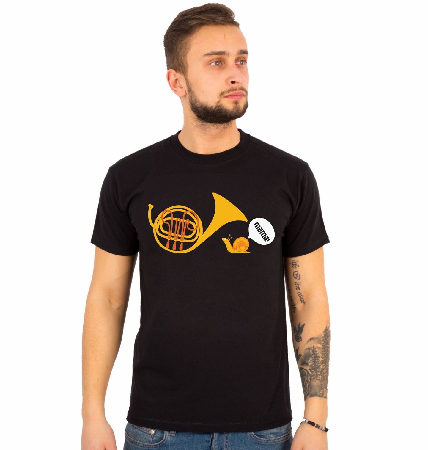 Pánské tričko Lesní Roh a Šnek. Originální a humorný motiv spojuje ilustraci lesního rohu se šnekem, který reaguje komiksovou bublinou s textem „mama!“. Obrázek neobsahuje klasický nápis, ale vizuální vtip je okamžitě pochopitelný. Kontrast mezi hudebním nástrojem a malým šnekem vytváří nečekanou a zábavnou scénu, která zaujme každého, kdo má rád netradiční humor.