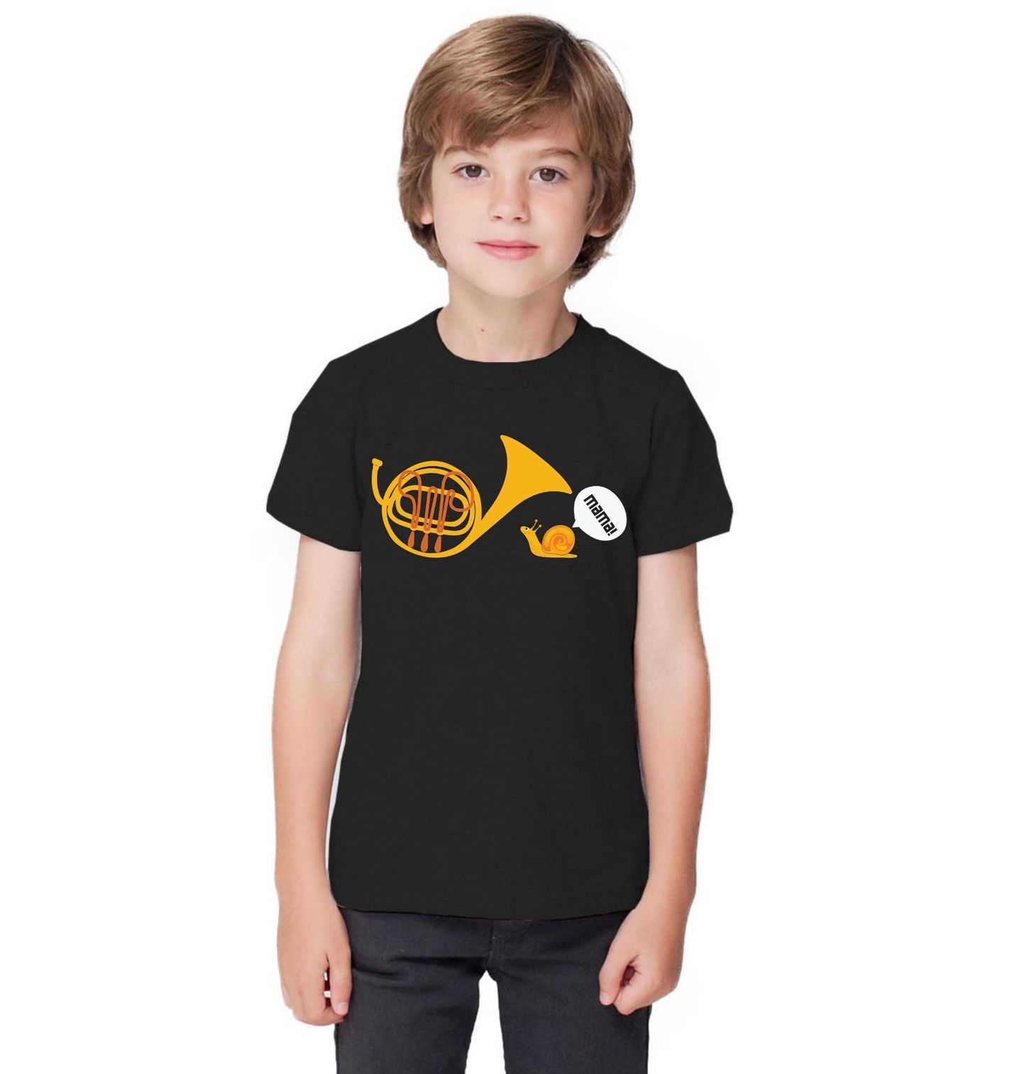 Dětské tričko Lesní Roh a Šnek. Originální a humorný motiv spojuje ilustraci lesního rohu se šnekem, který reaguje komiksovou bublinou s textem „mama!“. Obrázek neobsahuje klasický nápis, ale vizuální vtip je okamžitě pochopitelný. Kontrast mezi hudebním nástrojem a malým šnekem vytváří nečekanou a zábavnou scénu, která zaujme každého, kdo má rád netradiční humor.