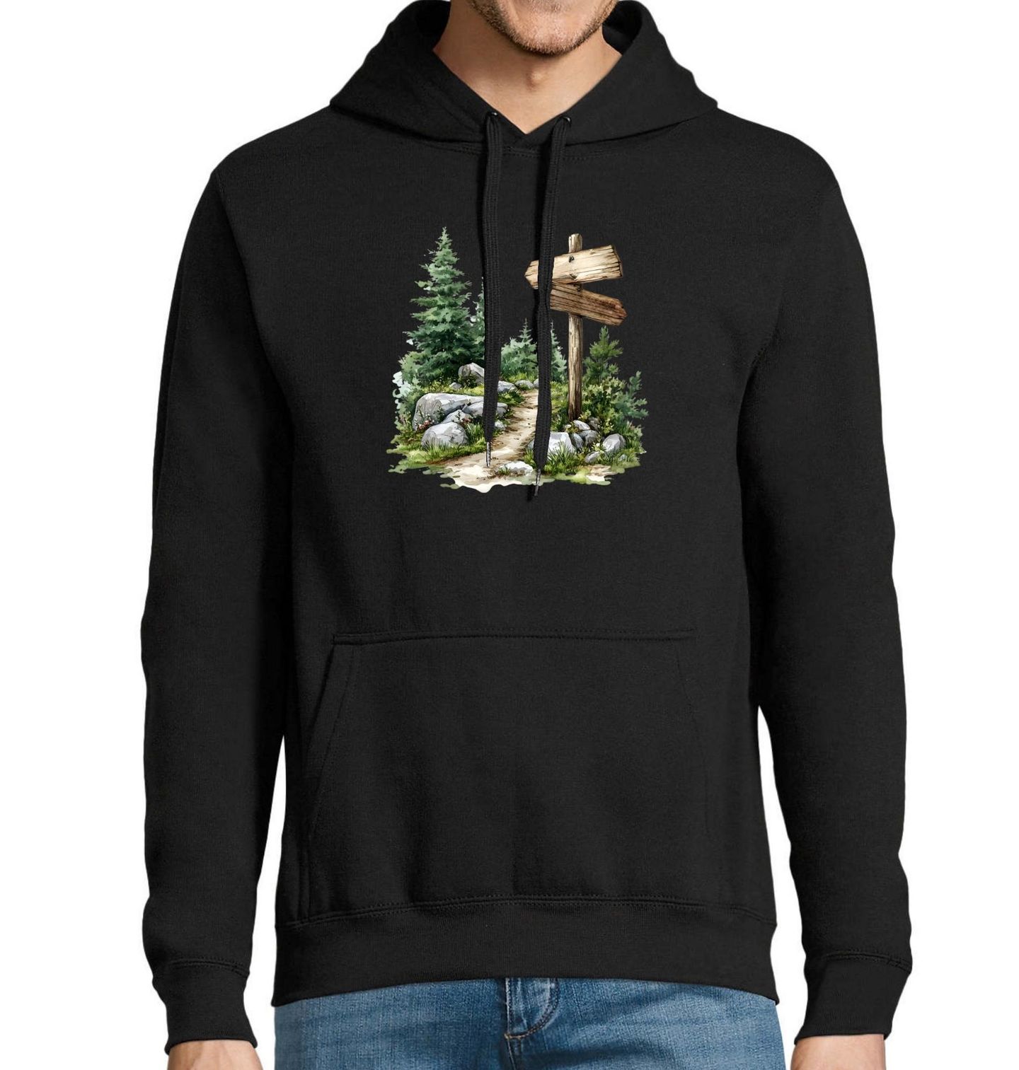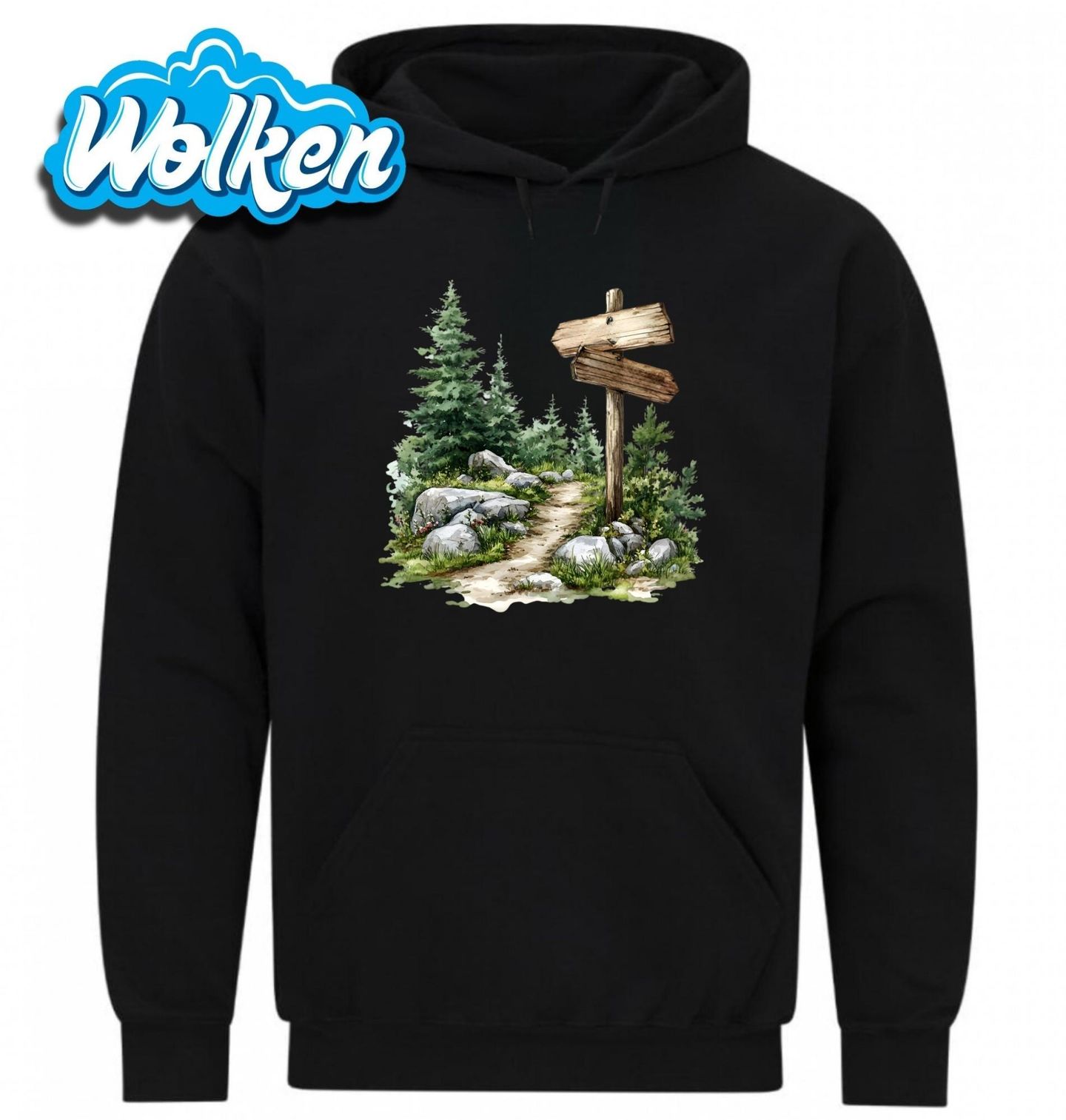 Pánská mikina Lesní Rozcestník. Scéna zachycuje klidný horský chodník lemovaný kameny a jehličnatými stromy, který zve k toulání a objevování nových směrů. Ideální pro všechny, kdo milují les a divokou přírodu. Skvělý dárek pro turisty, trampy i romantické duše.