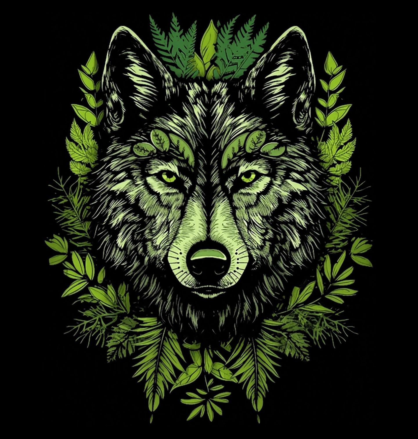 Dámské tričko Lesní Vlk. Silný a zároveň klidný pohled do duše divočiny. Tento jedinečný motiv zachycuje vlka obklopeného listy a zelení, jako by byl součástí samotného lesa. Vlk zde symbolizuje moudrost, sílu a spojení s přírodou.