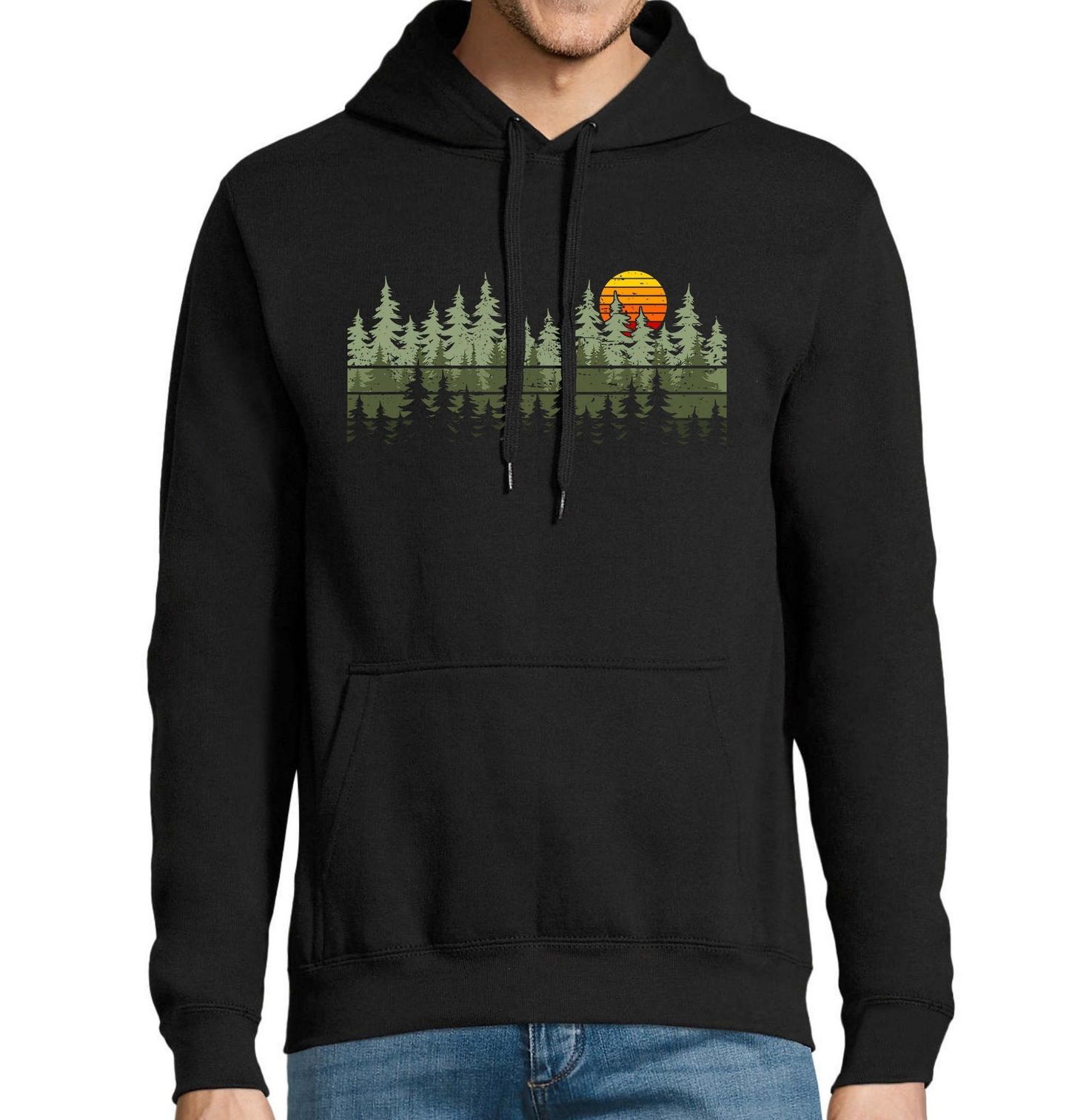 Pánská mikina Lesní Západ Slunce. Design zachycuje siluetu hustého lesa při zapadajícím slunci, jehož paprsky se odrážejí v klidné hladině jezera. Tento přírodní motiv je ideální pro turisty, táborníky i všechny, kdo milují klid lesa a teplé tóny večerní oblohy. Tričko je vyrobeno z kvalitní bavlny a potisk v retro stylu působí nadčasově a stylově.
