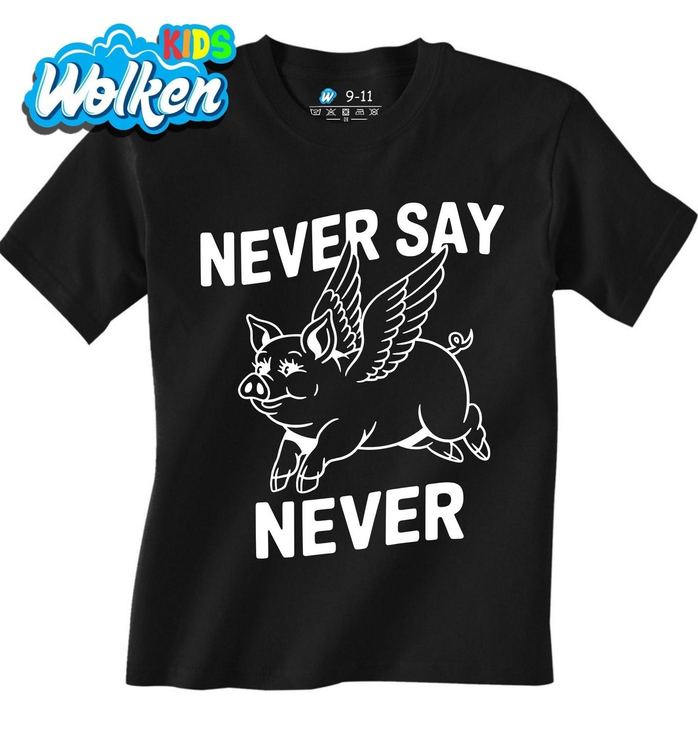 Dětské tričko Létající Prase Nikdy neříkej nikdy. Originální motiv s létajícím prasetem a nápisem „Never say never“ – ideální dárek pro každého, kdo věří, že nemožné neexistuje. Prase, které létá, je symbolem odvahy, překonání limitů a nadhledu. Perfektní volba pro milovníky vtipu, zvířat i sebevědomého stylu.