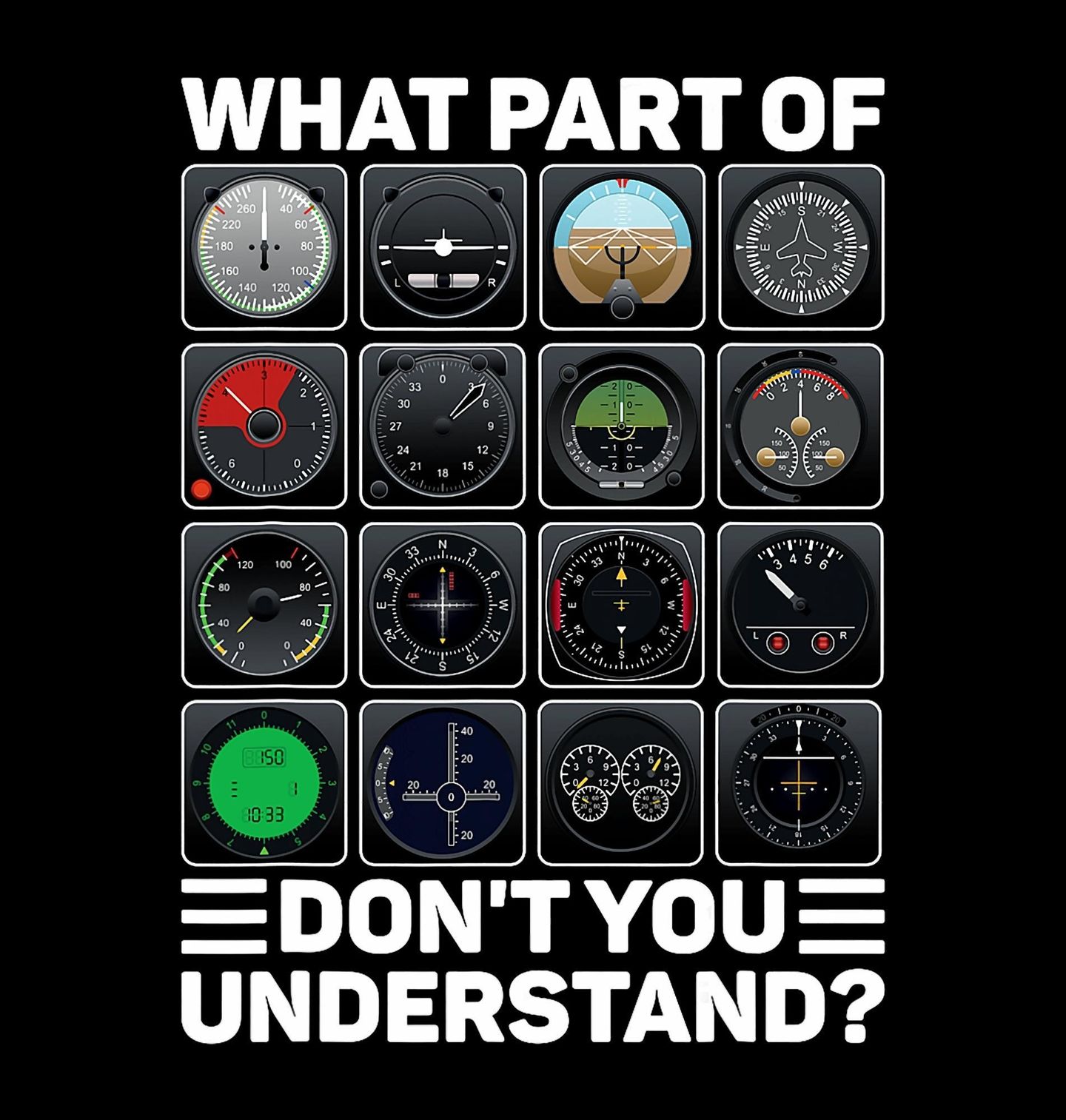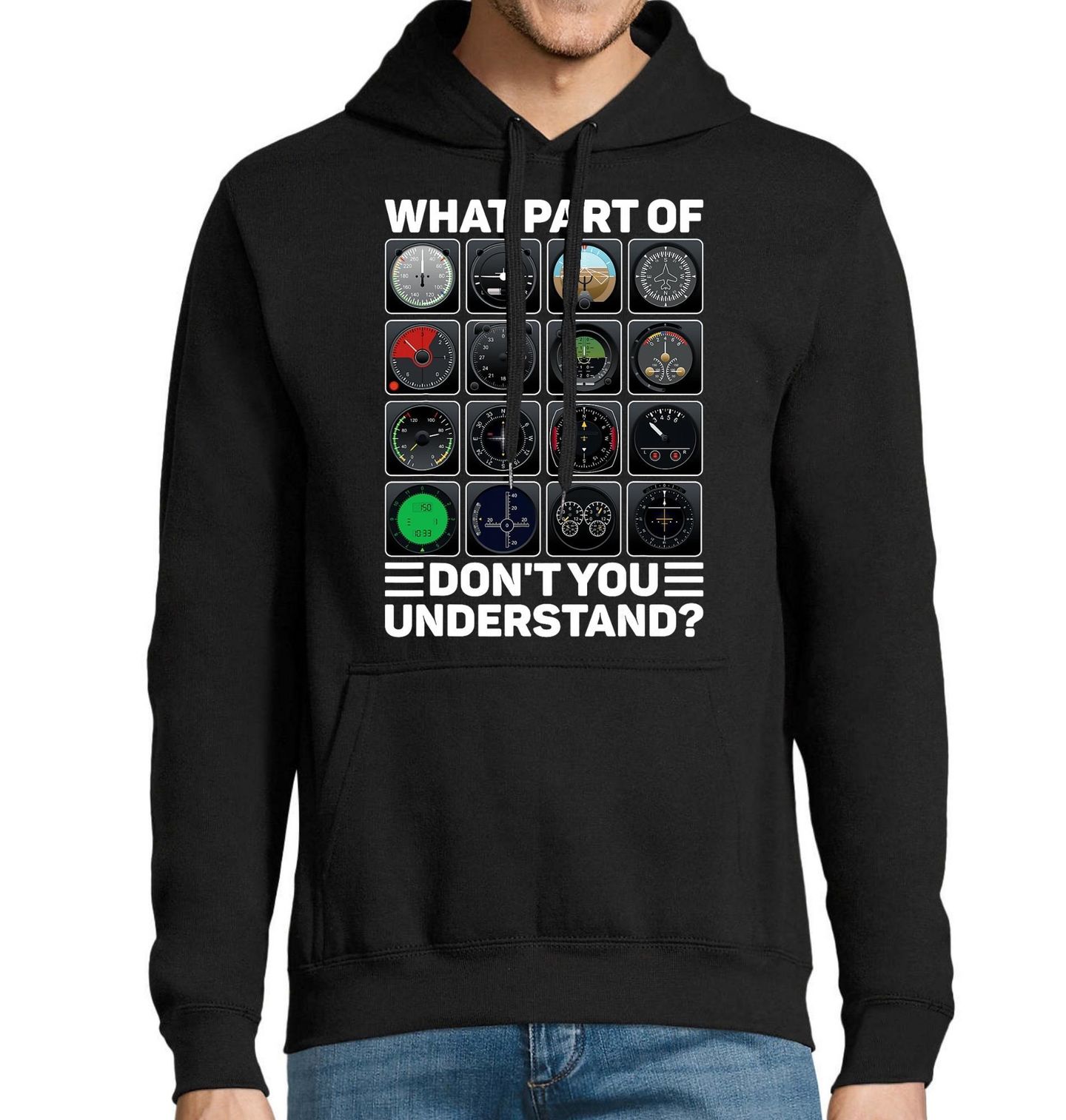 Pánská mikina Letecké Přístroje Které části nerozumíš? Technický motiv z prostředí letectví obsahuje text „WHAT PART OF … DON’T YOU UNDERSTAND?“, tedy „Které části nerozumíš?“. Detailní přístroje, které má každé letadlo osloví každého pilota nebo fanouška letectví.