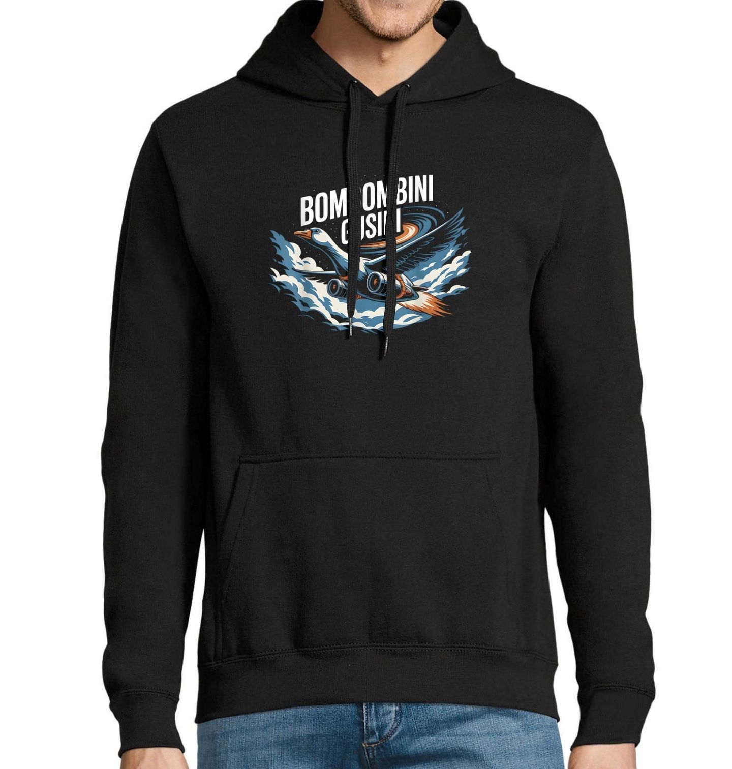 Pánská mikina Letící Husa Bombombini Gusini. Představ si husu. Ale ne jen tak obyčejnou. Tahle husa má na bocích turbíny, plameny jí šlehají z ocasu a míří si to napříč oblohou jako stíhačka z kresleného světa. To je Bombombini Gusini – neoficiální maskot chaosu, rychlosti a... no prostě italský brainrot na max levelu.