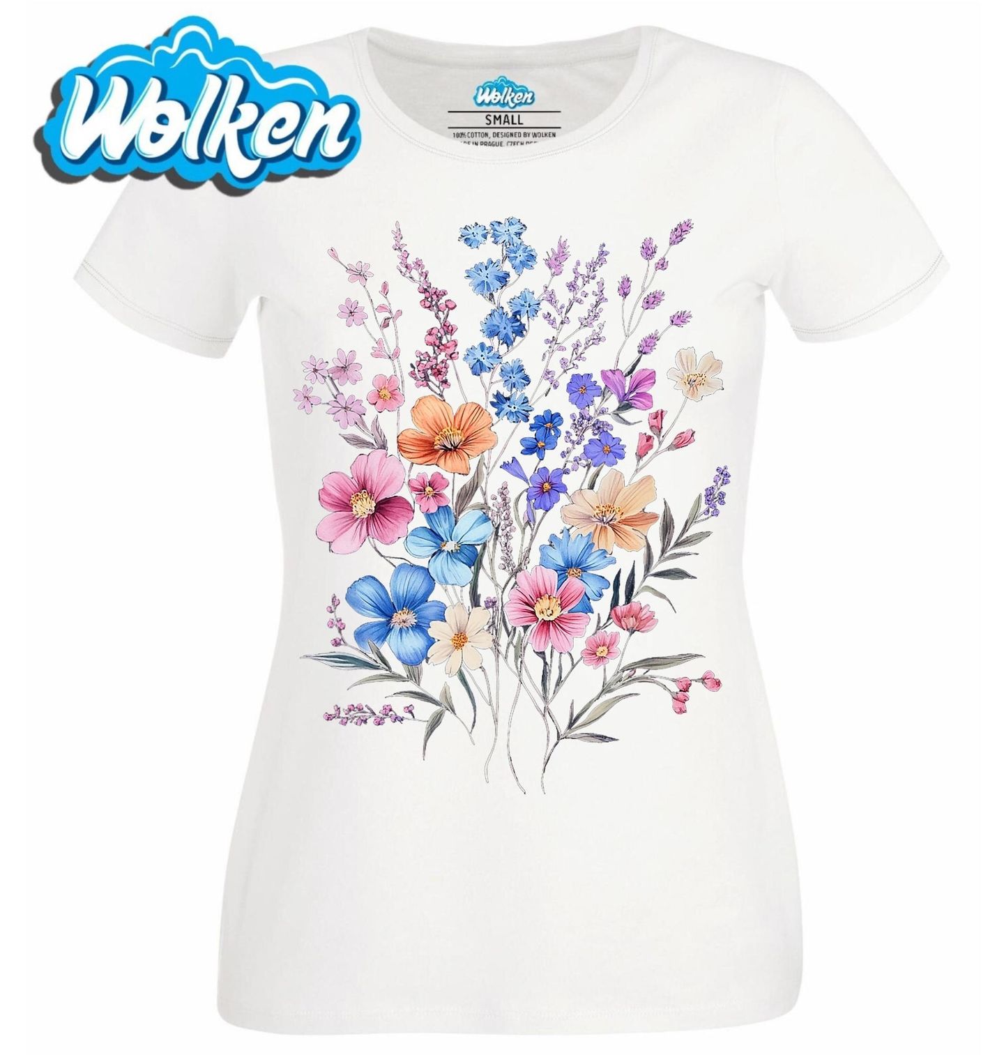 Dámské tričko Letní Louka Květin. Pastelové luční květiny – romantický přírodní motiv přináší něžnou kombinaci modrých lněných květů, fialových chrp, růžového šateru a dalších polních květin v akvarelovém provedení. Tento design je ideální pro všechny, kdo milují přírodu, jemné barvy a květiny.