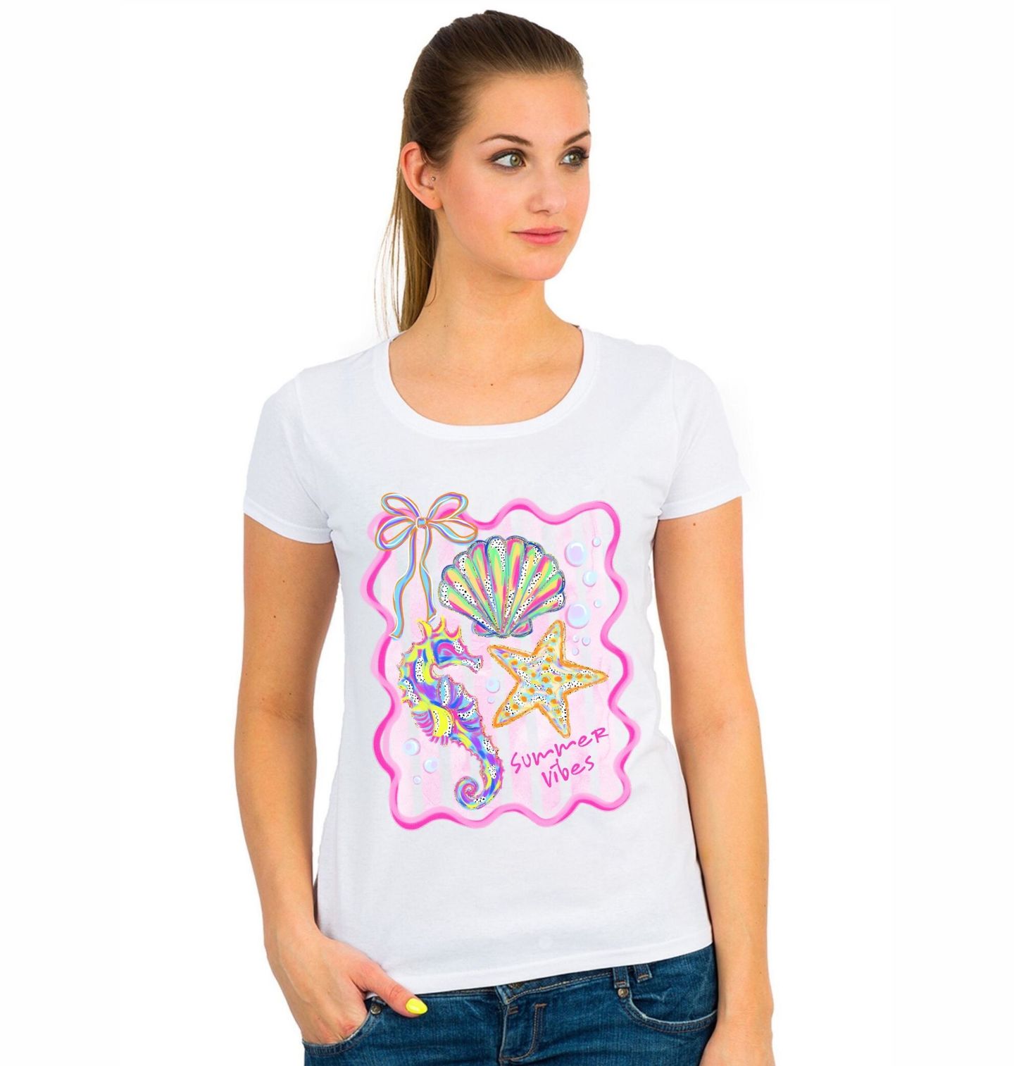 Dámské tričko Letní Moře Summer Vibes. Barevný design s motivy mořských živočichů jako je mořský koník, hvězdice a mušle doplněný textem „SUMMER VIBES“ (Letní atmosféra) přináší radost a energii léta. Kombinace pastelových barev a hravých tvarů evokuje dovolenou u moře. Ideální pro všechny, kdo milují léto, oceán a mořské motivy.