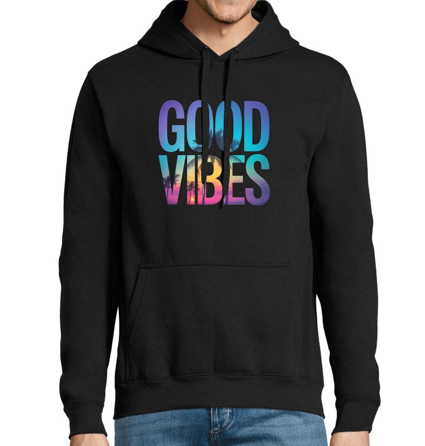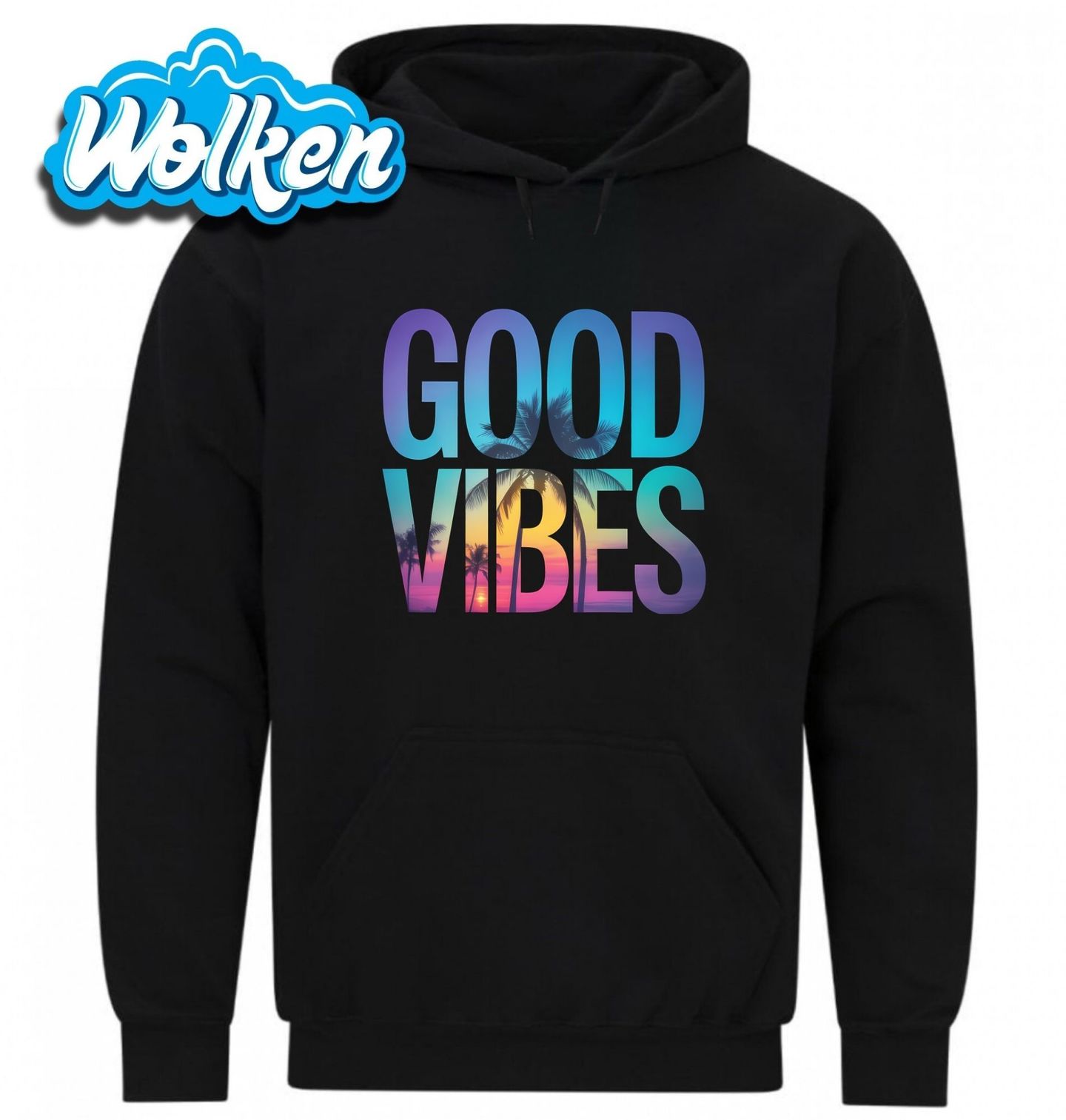 Pánská mikina Letní Palmy na Pláži Good Vibes. Good Vibes pro každého kdo miluje léto, moře, palmy a pláže. Design písma je vyplněn tropickým západem slunce, palmami a jemnými přechody barev připomínajícími letní oblohu. Ideální kousek pro dovolenou, festivaly nebo jen pro ty, kdo chtějí nosit kousek léta každý den.