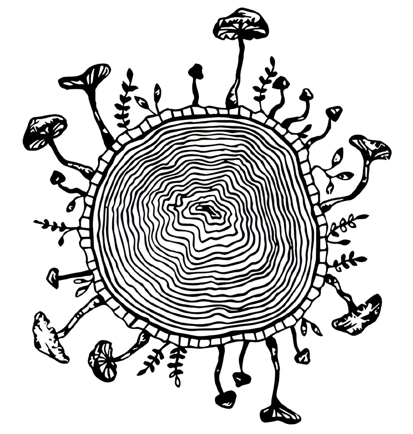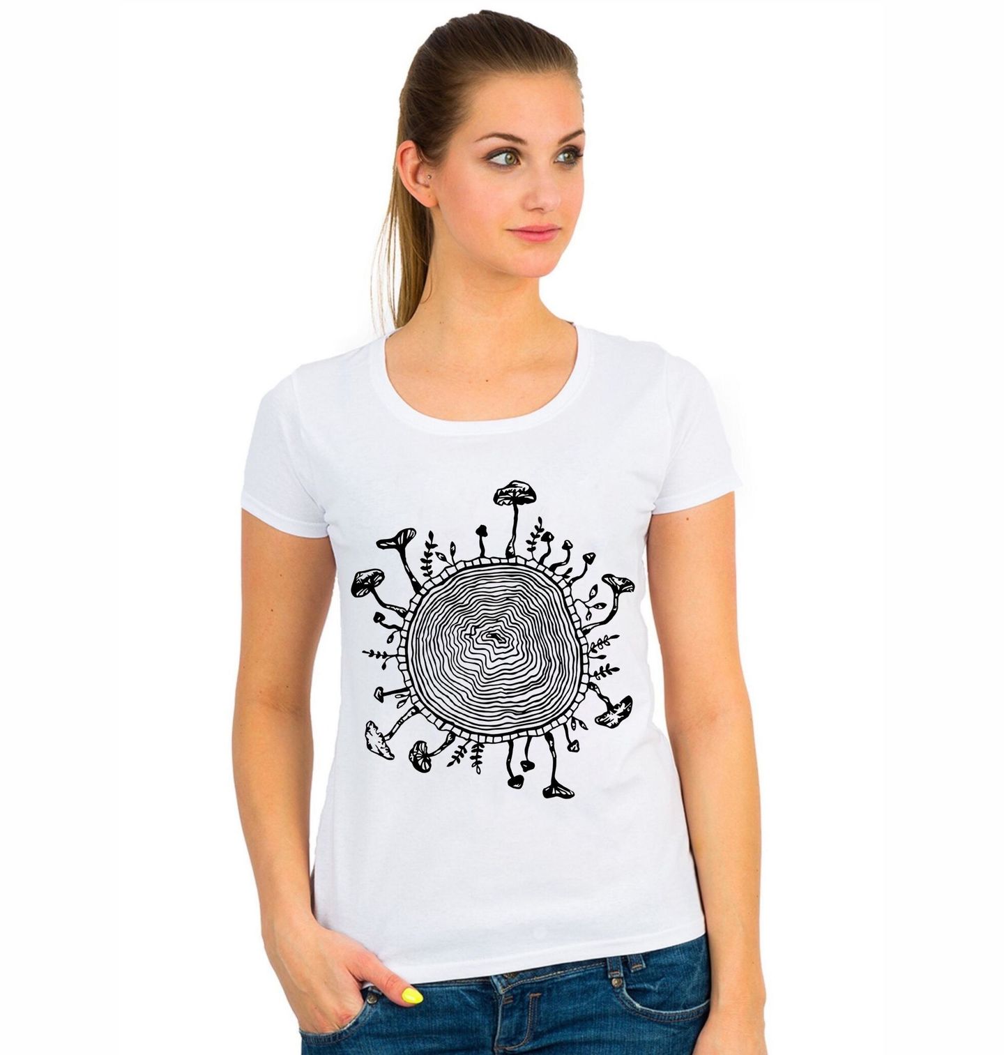 Dámské tričko Letokruhy Stromu s Houbami. Detailní ilustrace zachycující řez kmene stromu s výraznými letokruhy, které symbolizují plynutí času a sílu přírody. Kolem kmene vyrůstají stylizované houby a rostliny, které dodávají motivu jedinečný přírodní charakter. Tento design „řez stromem“ je ideální pro milovníky lesa, ekologie a přírodních motivů.