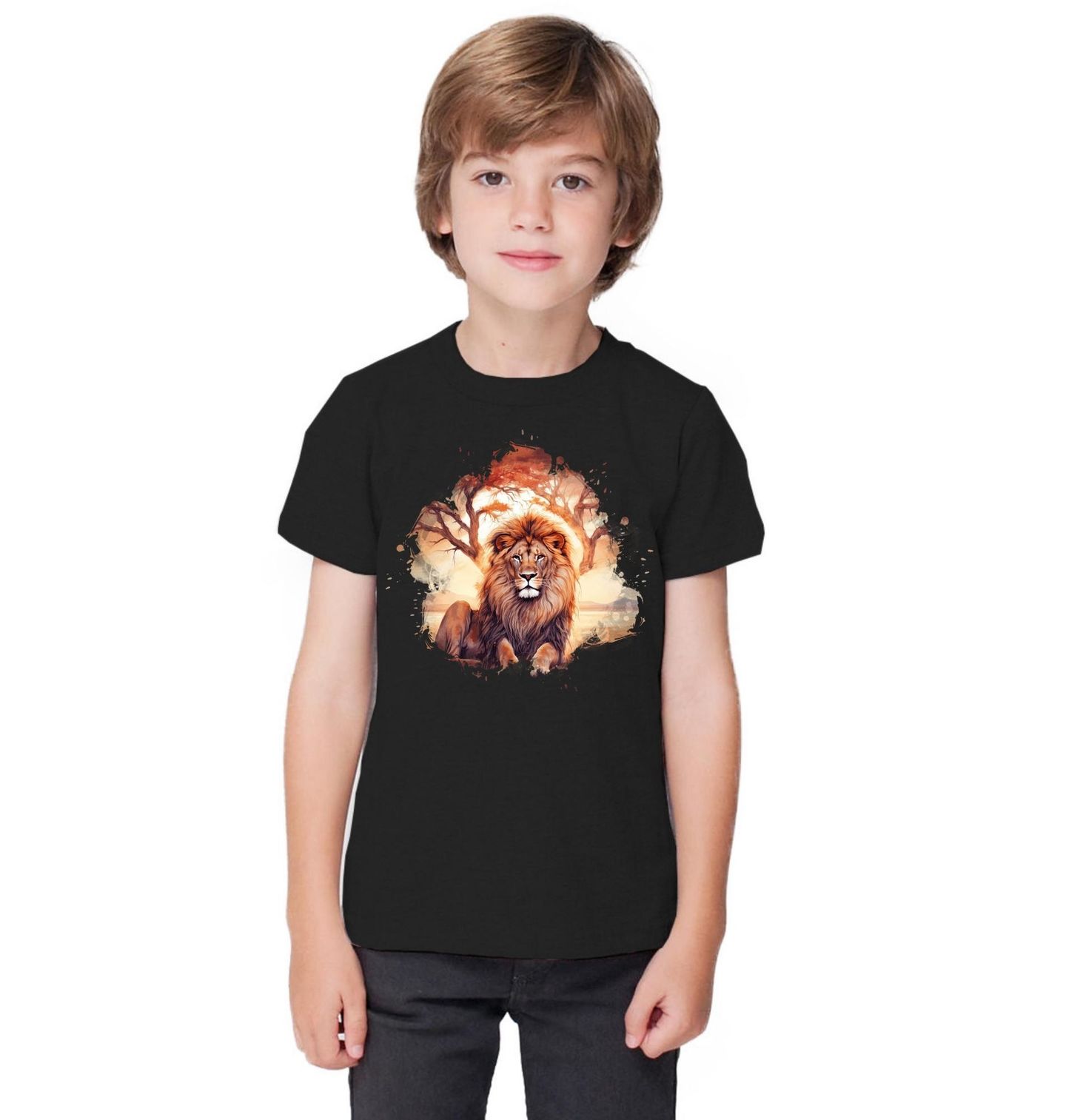 Dětské tričko Lev Král africké savany. Jeho bohatá hříva a soustředěný pohled vyzařují sílu, moudrost a respekt, který si každá šelma na vrcholu potravního řetězce zaslouží. Lev žije především v Africe, kde obývá savany, otevřené pláně a řídké lesy s typickými akáciemi. Právě toto prostředí je v motivu jemně naznačeno teplými barvami a siluetami stromů.
