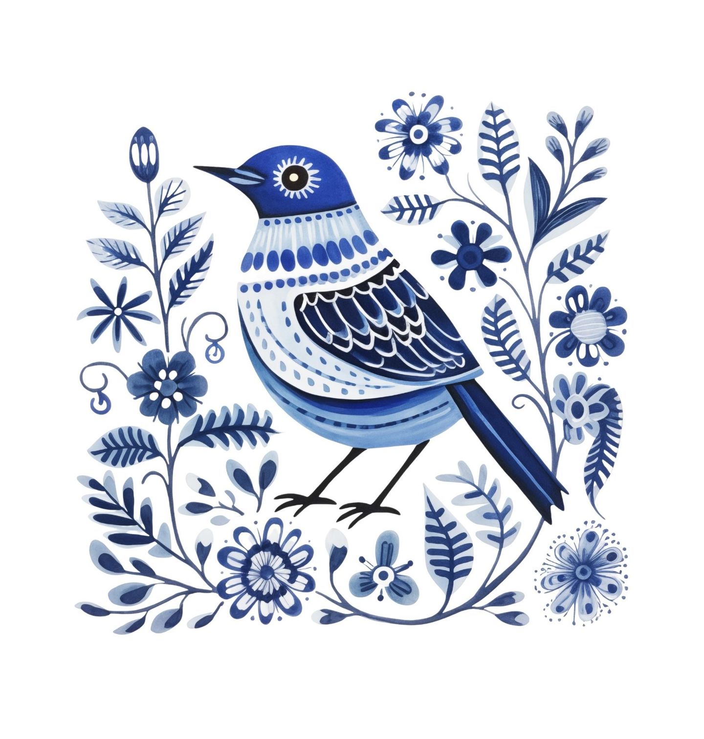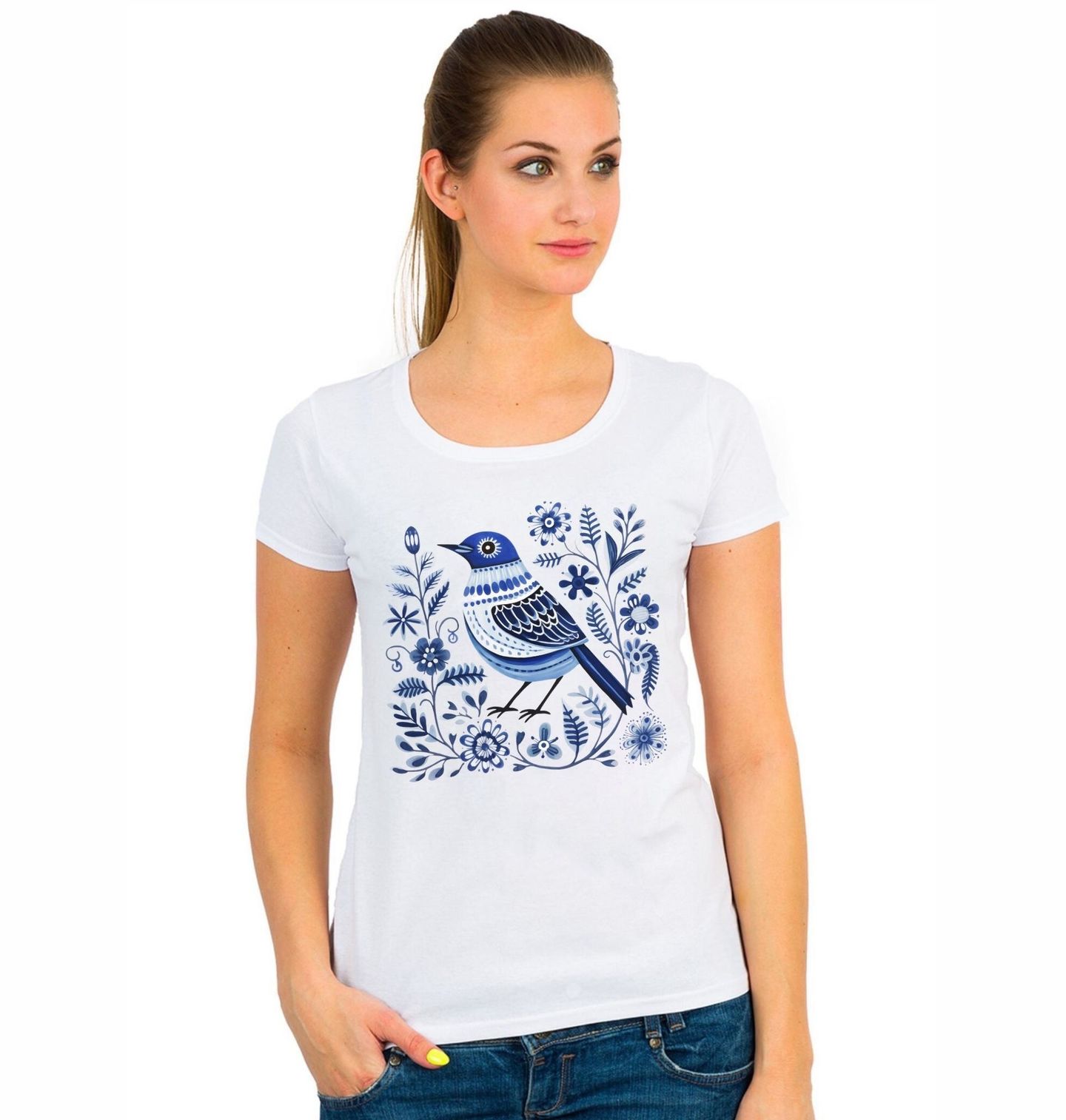 Dámské tričko Lidový Ptáček Folk. Něžný motiv zobrazuje pták obklopený stylizovanými květiny v jemném folk stylu inspirovaném lidovým uměním. Typická modrá barevnost a dekorativní prvky připomínají tradiční vzory, které jsou však zpracované moderním a čistým způsobem. Pták symbolizuje svobodu a lehkost, zatímco květiny dodávají motivu harmonii a přírodní krásu.